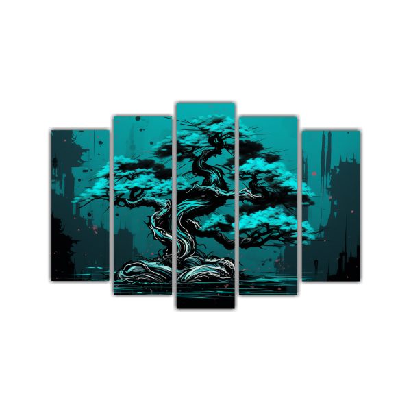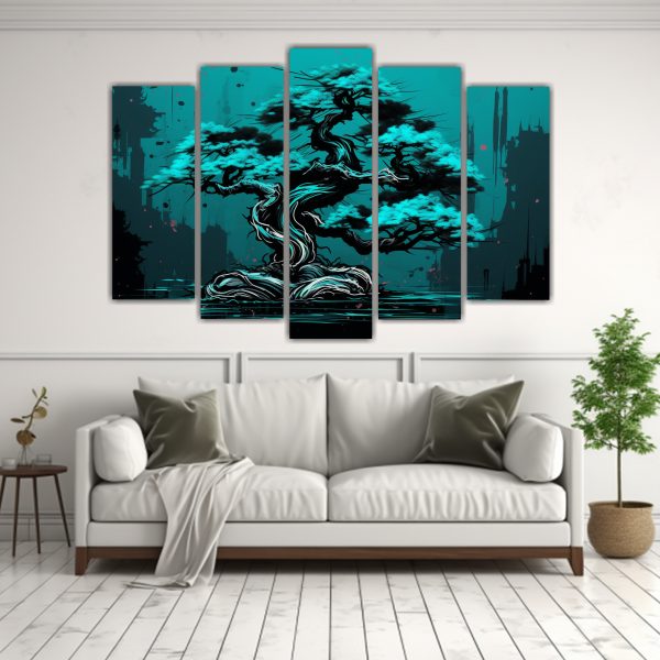 Pintura De Pared Con Bonsái En Turquesa Y Negro Neonoir.