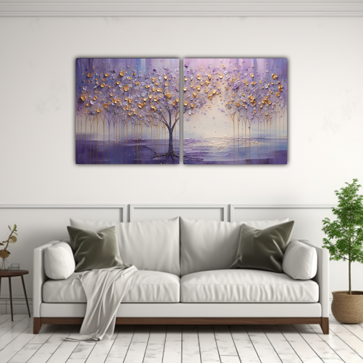DecoCuadros ofrece una pintura de pared creativa en tonos morado y dorado, perfecta para darle un toque elegante y sofisticado a tu sala Nuestros cuadros decorativos están impresos en tela de alta calidad, montados en bastidores de madera y cuentan con una excelente definición de colores Con un diseño exclusivo de nuestra tienda, ofrecemos la mejor calidad del mercado a precios económicos