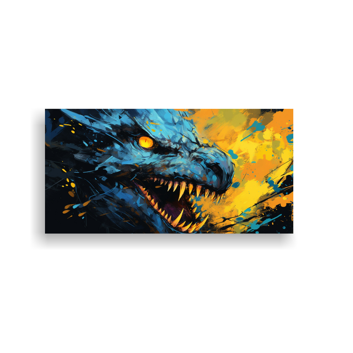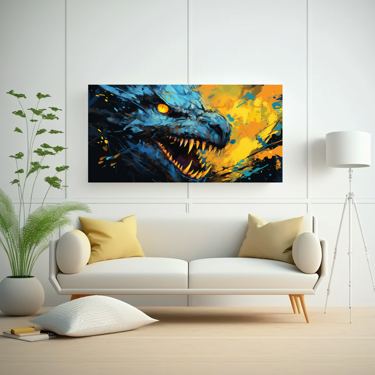 Coloca esta pintura de pared Dragón en Amarillo y Azul en tu sala de estar para crear un ambiente de contraste y elegancia Combínalo con muebles en tonos neutros y detalles en verde azulado para resaltar su belleza única