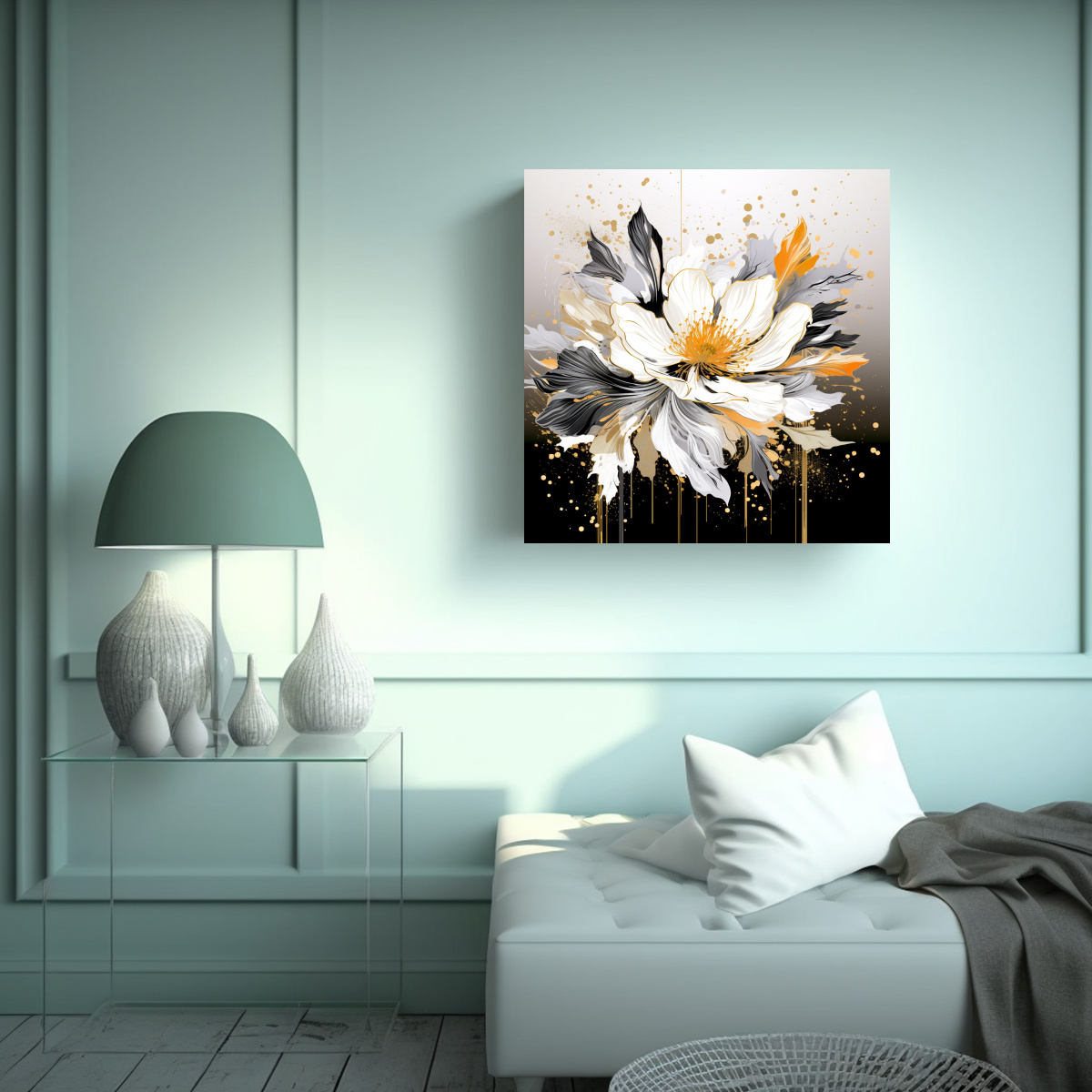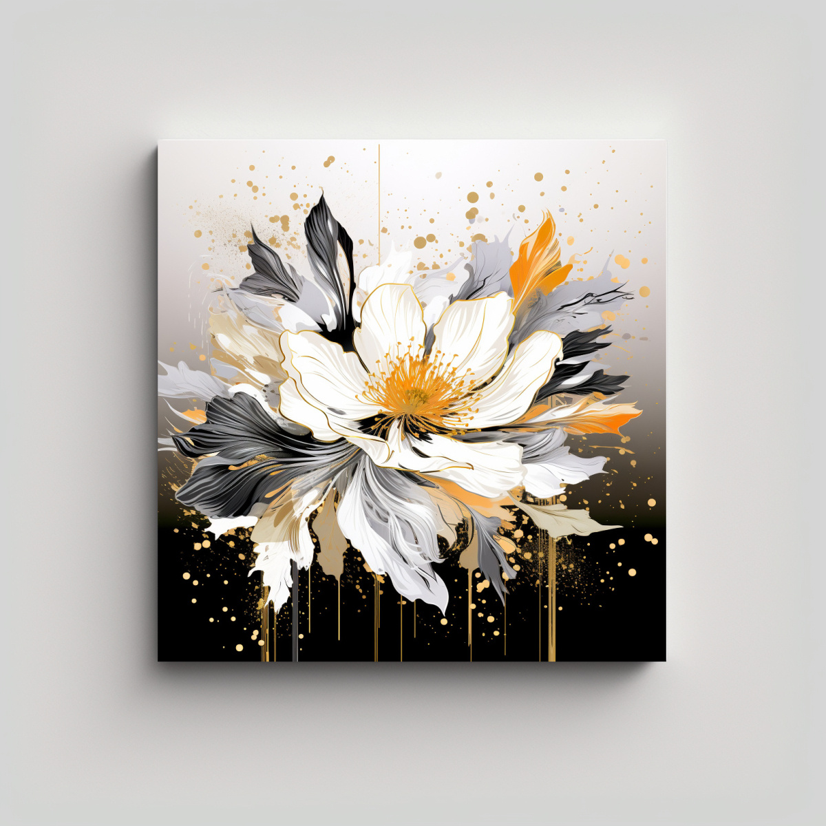 Este cuadro de Pintura de Pared Vanguardia en Blanco y Dorado, Atmosfera Neonoir sería ideal para darle un toque moderno y elegante a tu sala de estar Combínalo con muebles en tonos gris o beige para crear una atmósfera sofisticada Colócalo sobre un sofá negro o colgando en una pared blanca para resaltar su belleza única