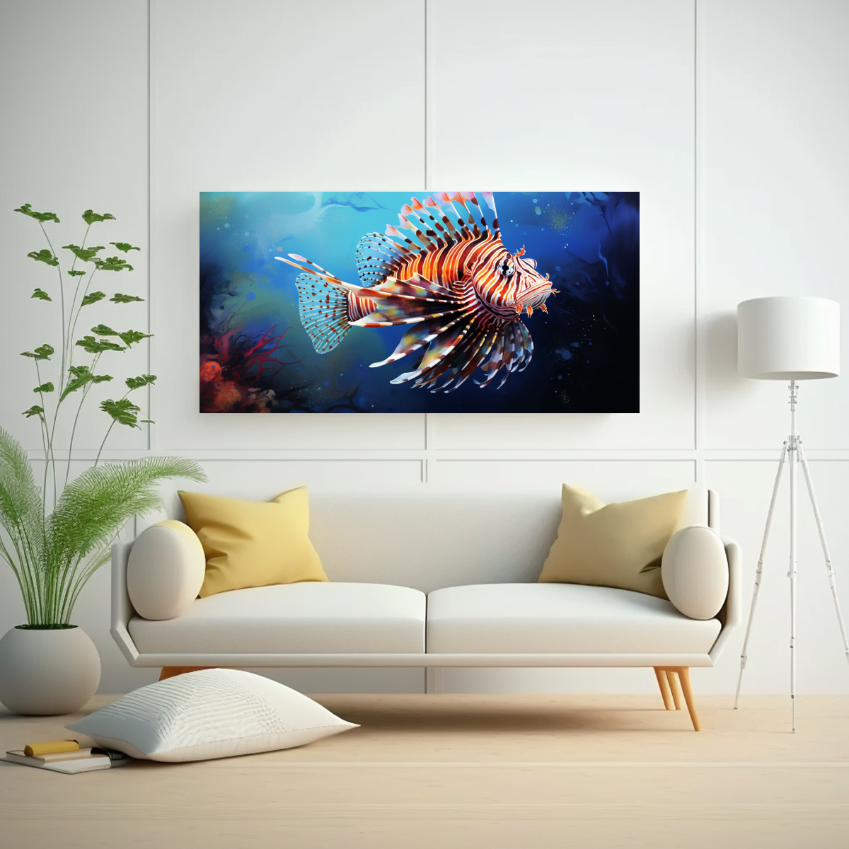 Este cuadro de un Pez León en Acuarelas es ideal para dar vida a tu sala de estar o área de comedor Combínalo con tonos neutros como beige o blanco para resaltar su belleza acuática