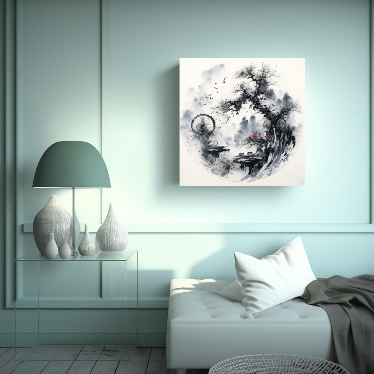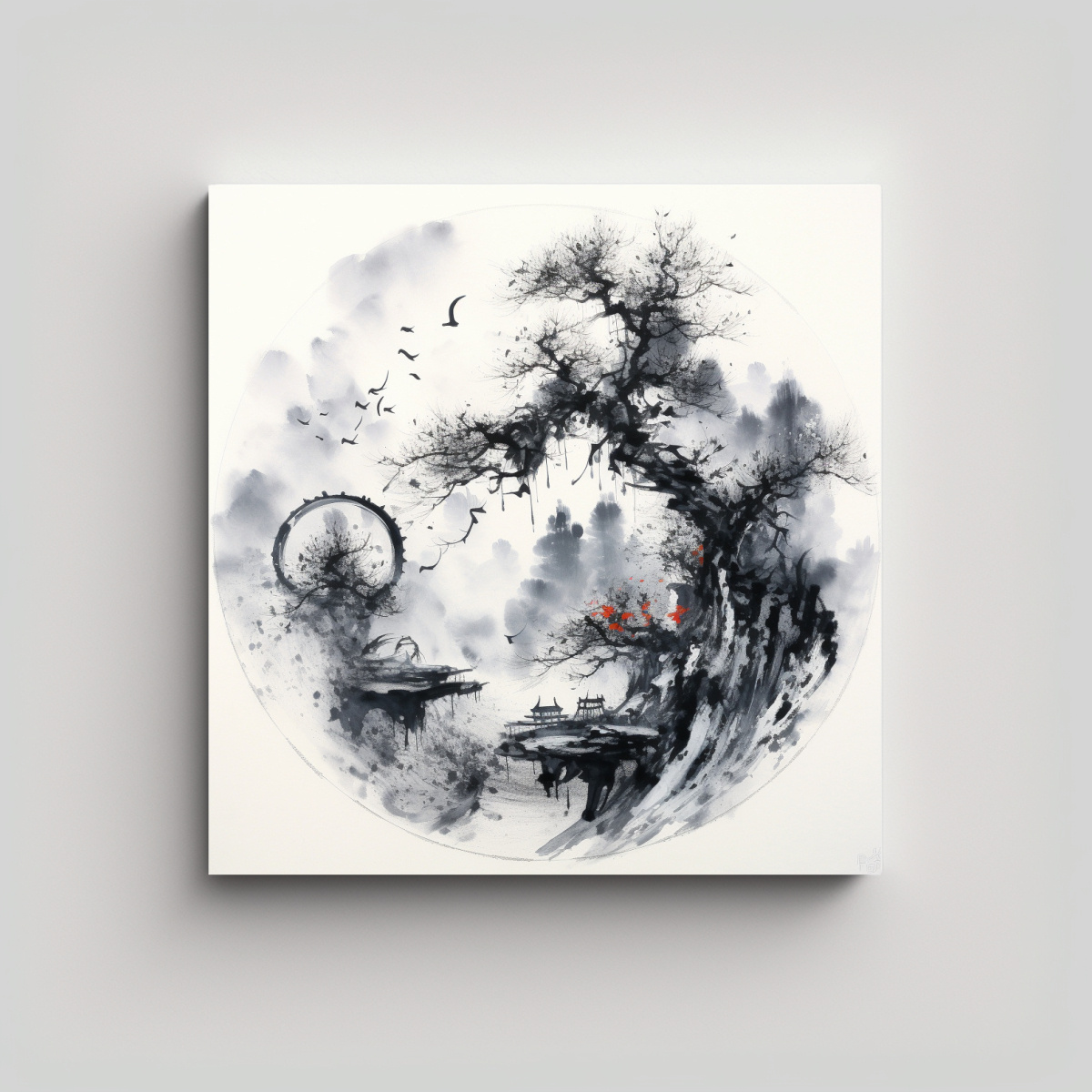 Coloca este hermoso cuadro de tinta china en tu sala de estar para darle un toque elegante y sofisticado Combina perfectamente con muebles en tonos neutros como beige y gris, creando un ambiente armonioso y relajante