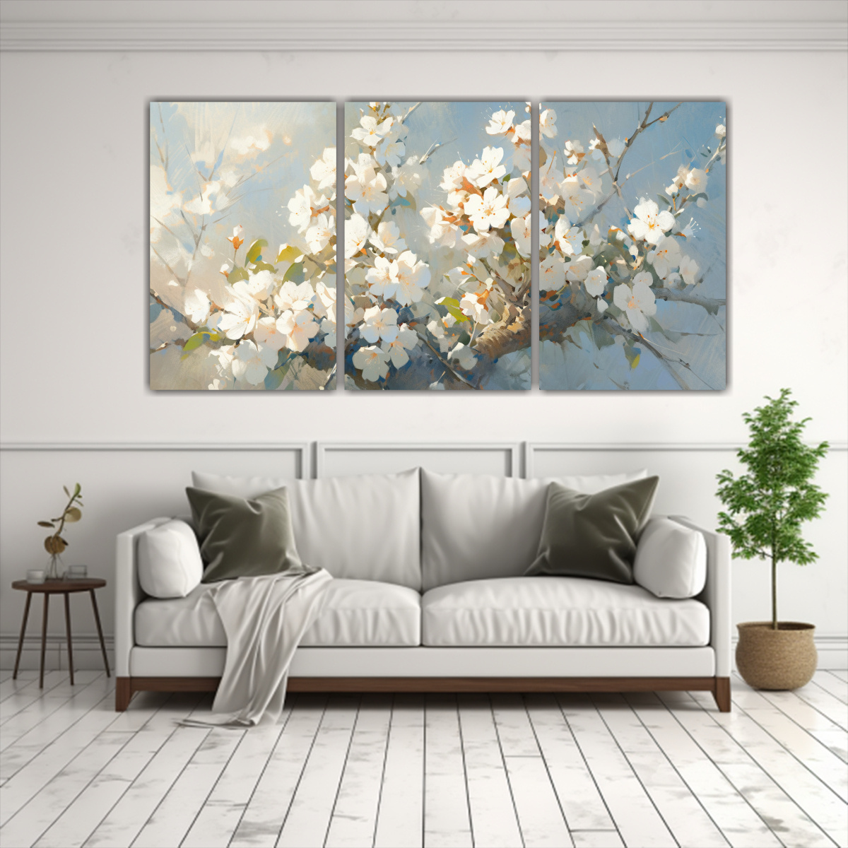 DecoCuadros ofrece una Pintura de Tres Cuadros Alta Calidad Flores de Cerezo Blanco o Sakura en Lienzo Impresos en tela de alta calidad con bastidores de madera Sin duda, la mejor opción para decorar tus espacios con estilo y elegancia