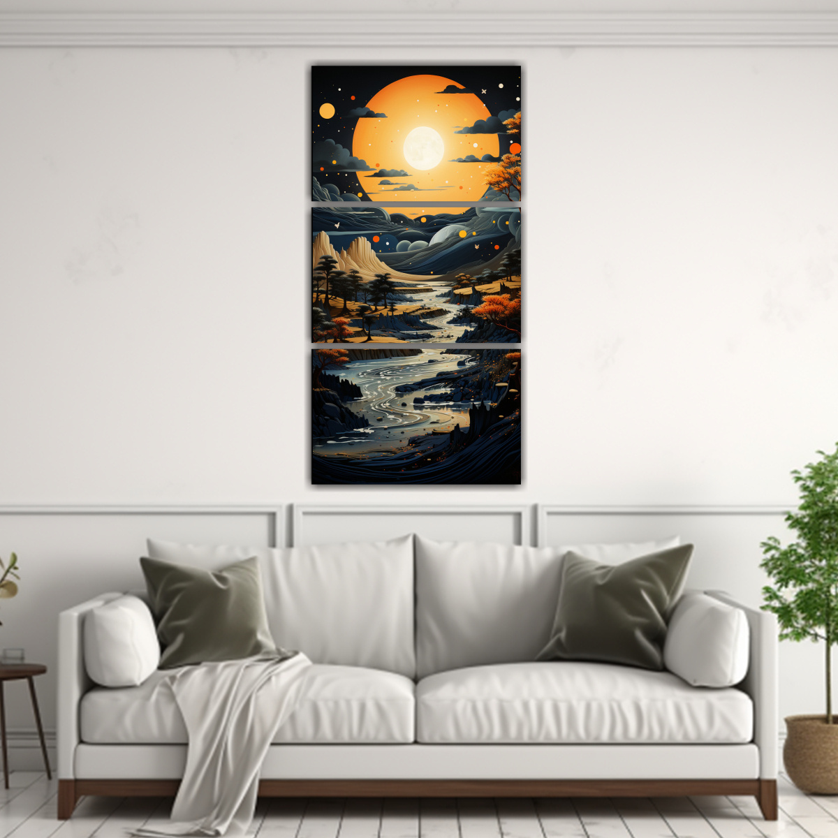 Nuestro cuadro de vitalidad con luna y montañas es una obra de arte que combina los colores coral, negro, dorado, beige, gris, carmesí y azul marino grisáceo Con su diseño exclusivo y calidad premium, este cuadro dará vida a cualquier ambiente