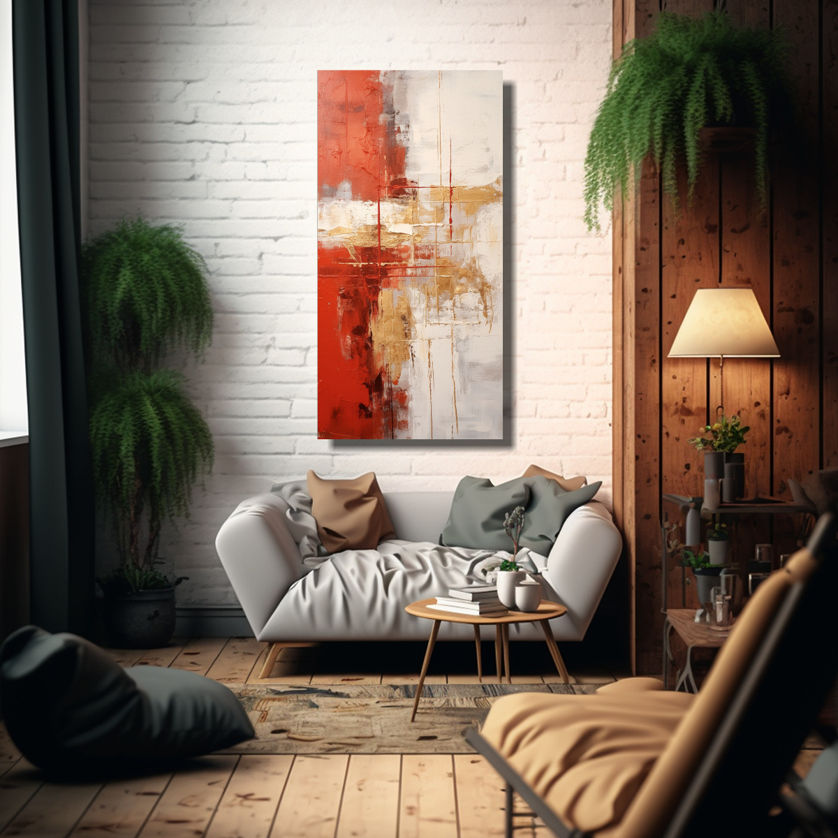 Este cuadro sería perfecto para decorar una sala de estar moderna, creando un punto focal en la pared principal Combínalo con muebles en tonos neutros y elementos decorativos en los colores presentes en la pintura, para lograr un ambiente cálido y sofisticado