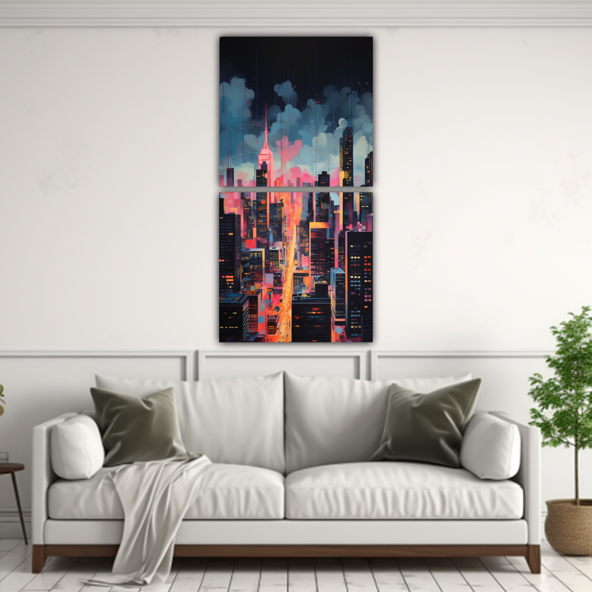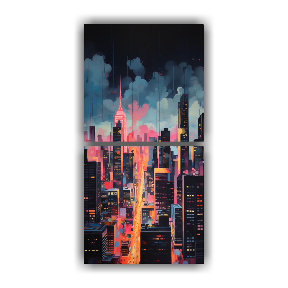 Pintura Decorativa Abstracta De Una Ciudad Al Crepúsculo En Dos Cuadros Modernos