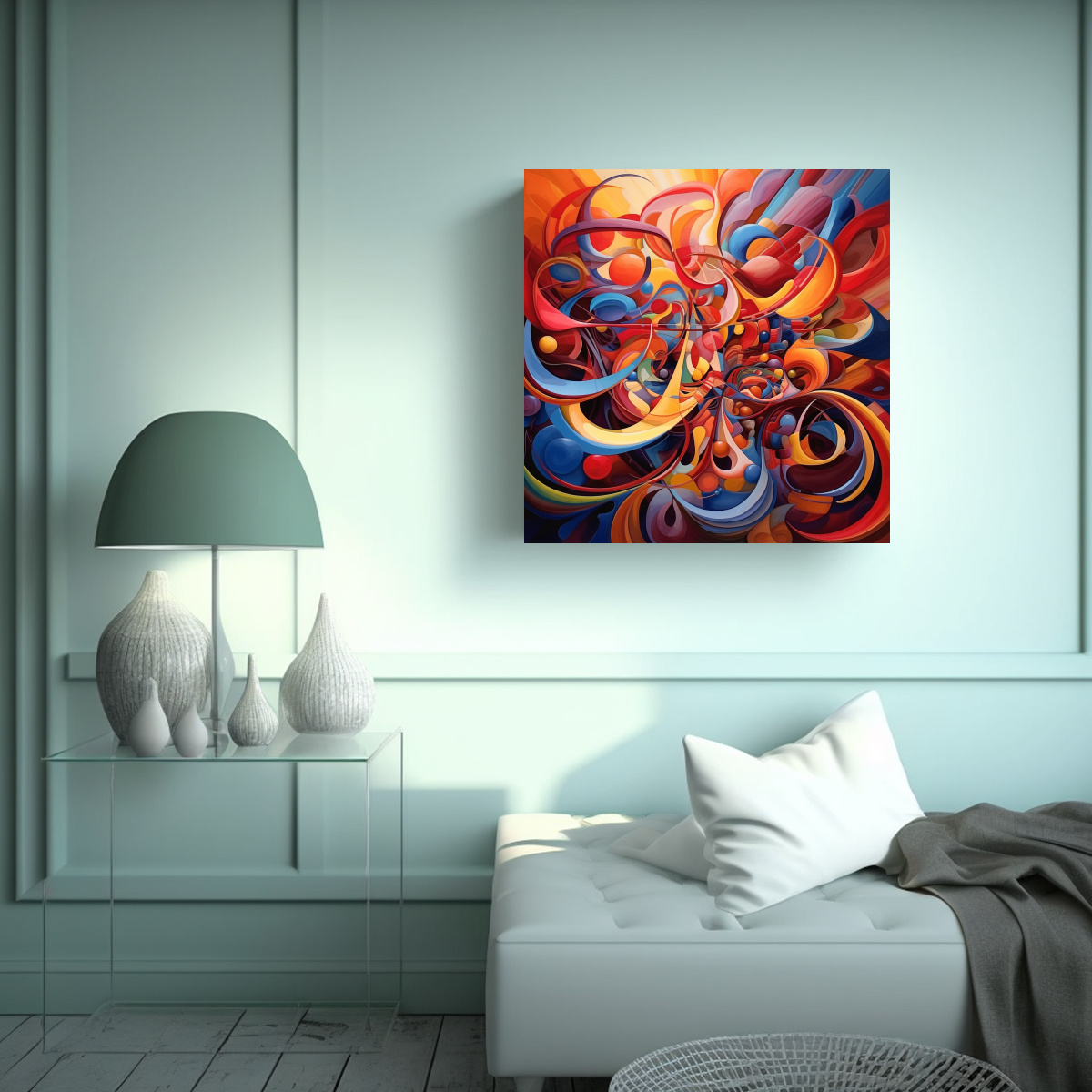 Este cuadro abstracto sobre lienzo en bastidor es perfecto para decorar tu sala de estar o tu dormitorio Sus colores plateado, carmesí, azul marino grisáceo, gris, coral, verde azulado y turquesa le darán vida y energía a cualquier ambiente Combínalo con muebles y accesorios en tonos neutros para crear un contraste moderno y sofisticado ¡No esperes más y hazte con este hermoso cuadro exclusivo de DecoCuadros!