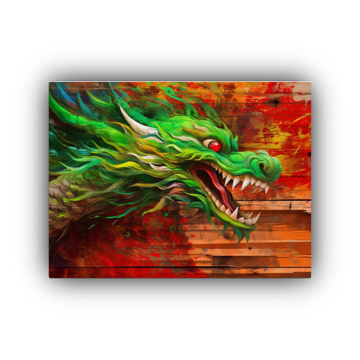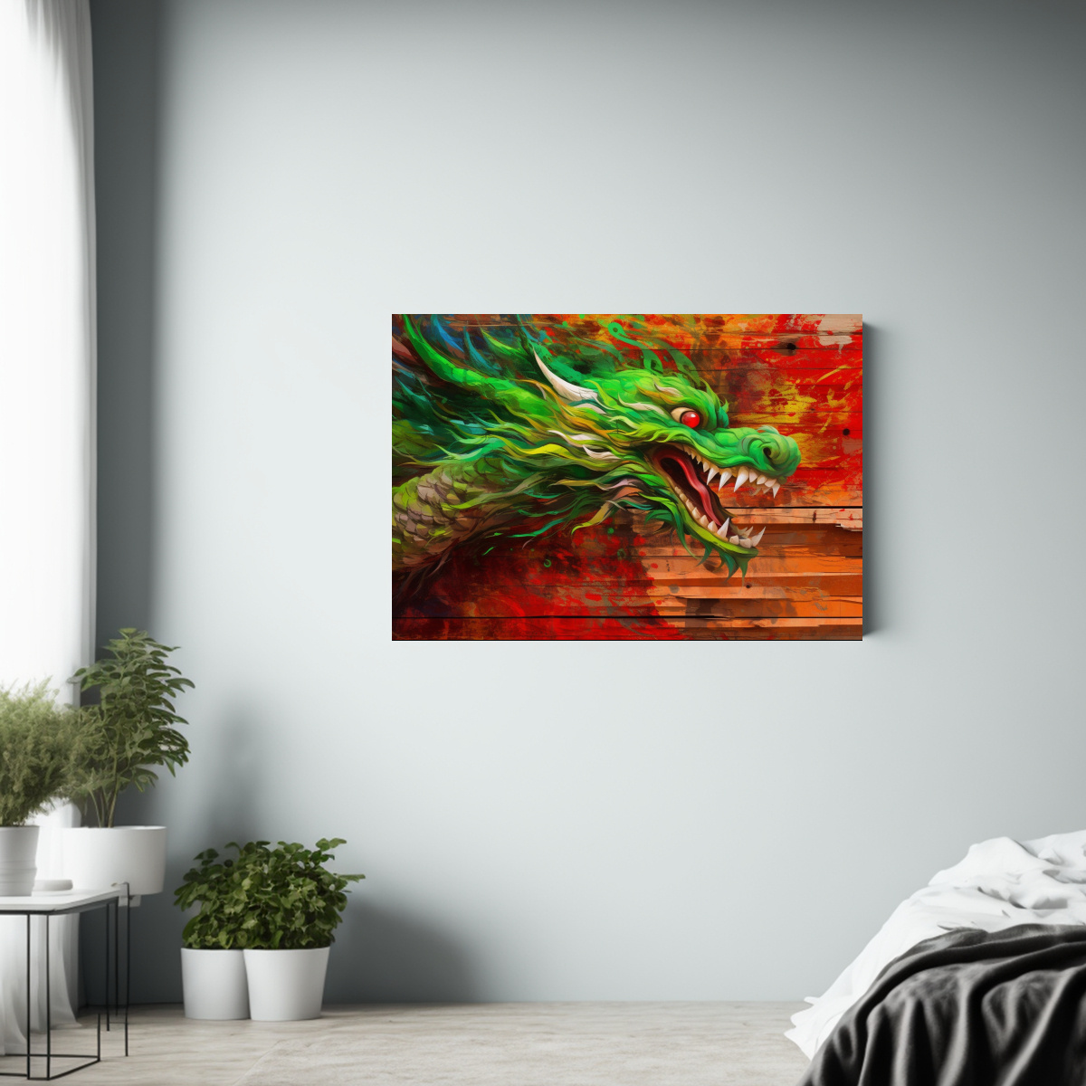 Pintura Decorativa Abstracta Vibrante De Dragón Verde Chino En Madera.