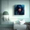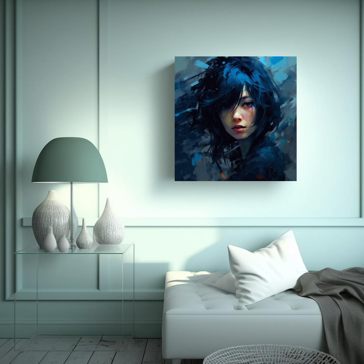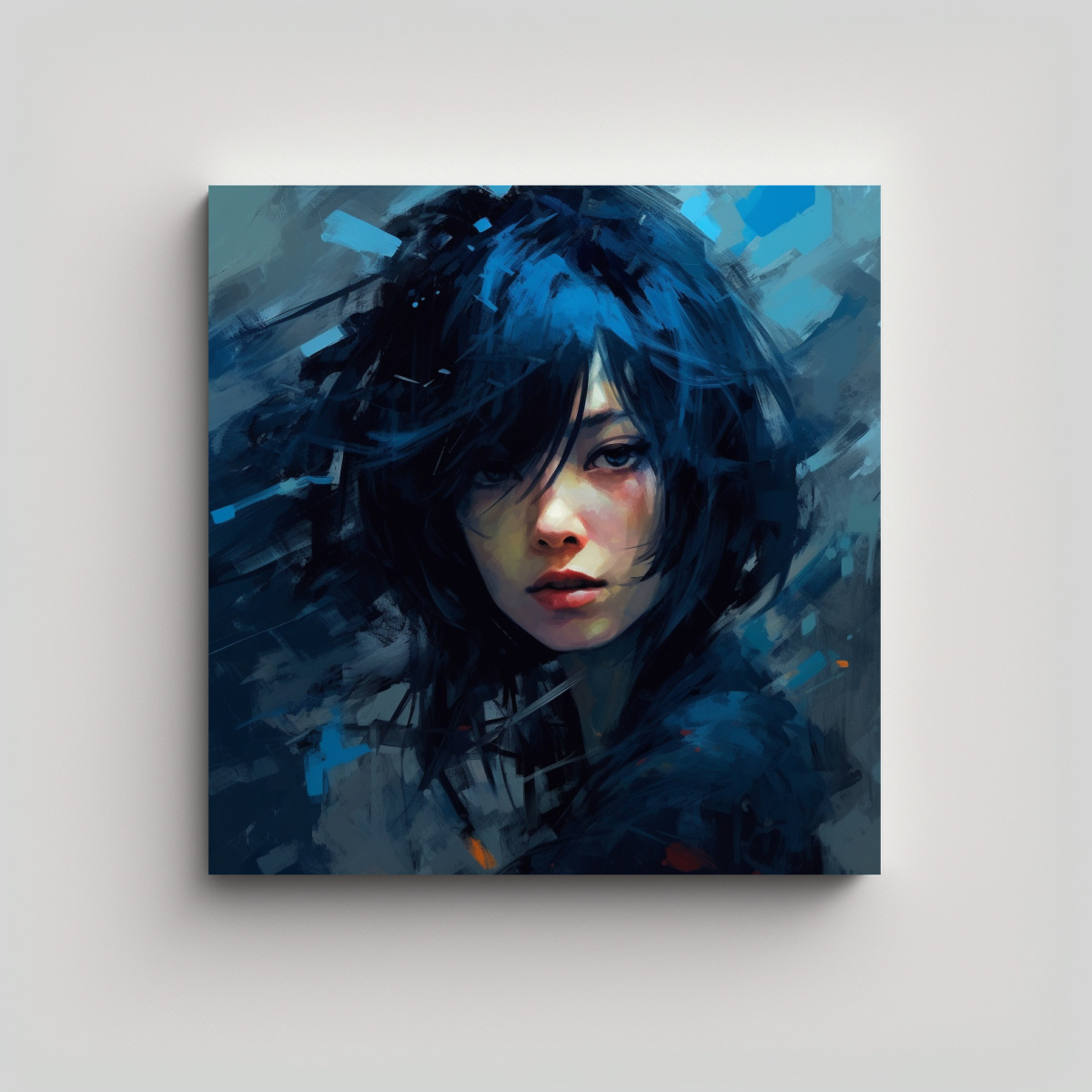 Pintura Decorativa Acuarela Retrato Femenino Asiático En Lienzo Azul Oscuro