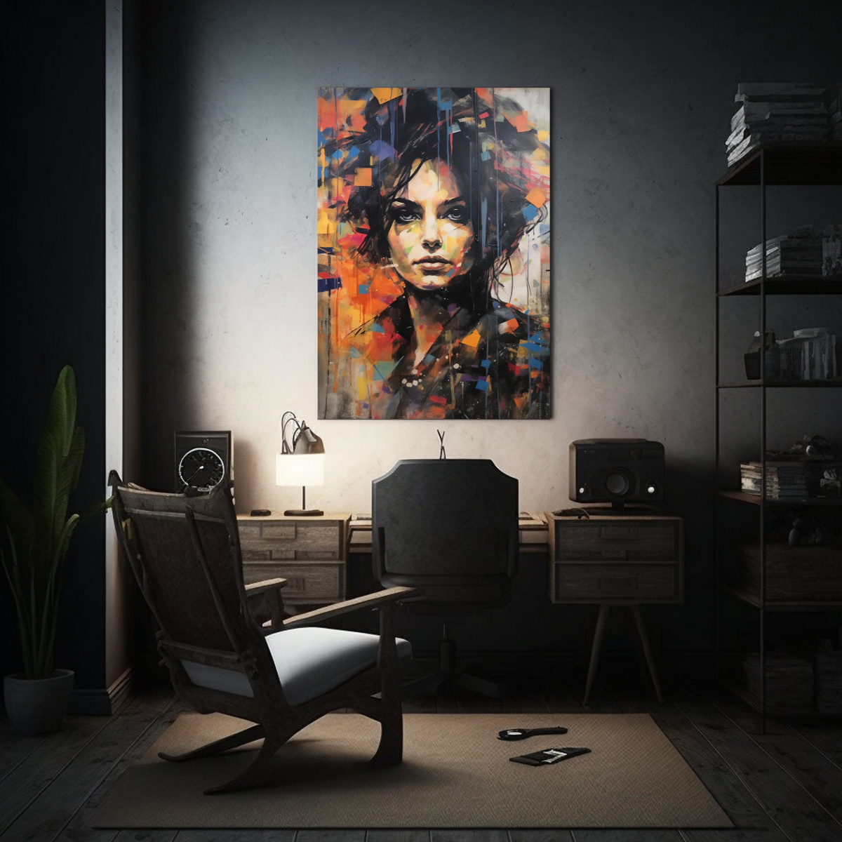 Coloca este cuadro en tu sala de estar para crear un contraste entre la expresividad de la mujer y la caótica ciudad Combínalo con muebles en tonos neutros y accesorios decorativos en colores similares para lograr una armonía moderna y sofisticada