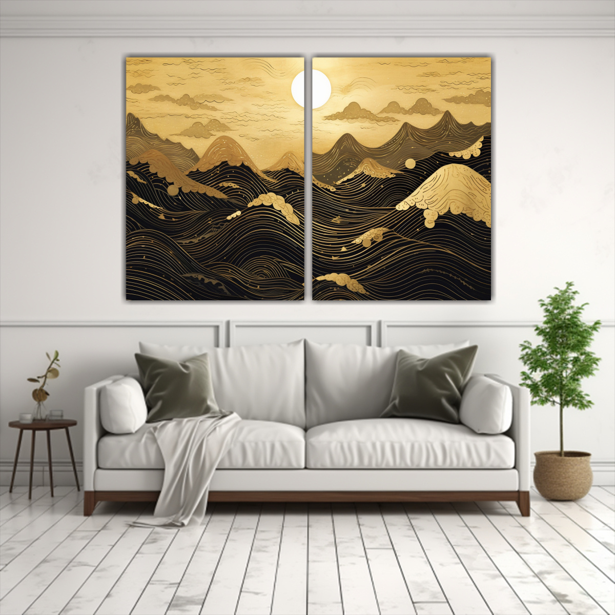 Renueva tu hogar con este cuadro refinado que combina la elegancia del oro con la serenidad de la luna sobre las montañas Impreso en tela de alta calidad con bastidor de madera, este diseño único añadirá un toque de sofisticación a tu espacio Aprovecha nuestras entregas rápidas y gratuitas en Santiago para disfrutar pronto de esta obra de arte en tu hogar