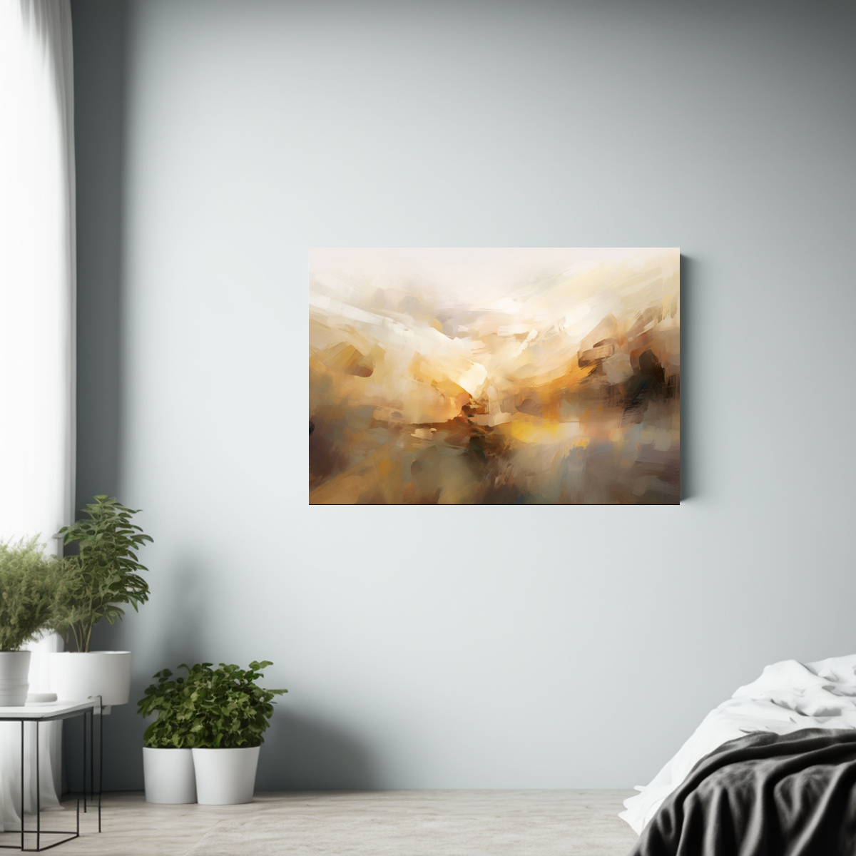 Para realzar la elegancia de tu sala de estar, coloca este cuadro tonos tierra difuminados sobre un sofá beige claro y complementa con cojines en tonos grisáceos y azules Añade una alfombra de pelo suave en tonos chocolate y plateado para crear un ambiente acogedor y sofisticado a la vez