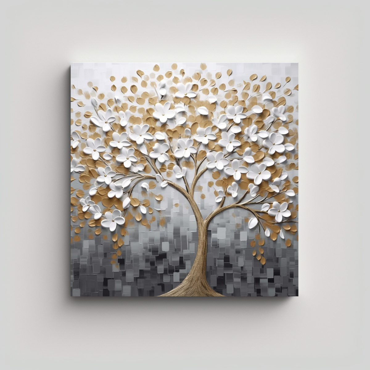 DecoCuadros ofrece una pintura decorativa de árbol abstracto con pétalos blancos, dorados y grises en tela en bastidor Nuestros cuadros destacan por su alta calidad y diseño exclusivo Ofrecemos envío gratis en Santiago y entregas rápidas en todo el país Encuentra el mejor precio y calidad del mercado en DecoCuadros