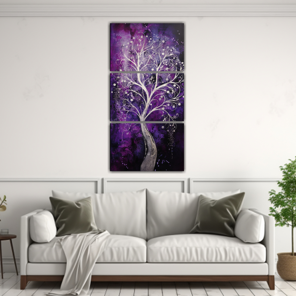 Este hermoso cuadro de árbol en morado y plata de DecoCuadros es perfecto para añadir un toque de sofisticación a tu sala de estar Colócalo sobre una pared de color blanco o gris claro para resaltar su belleza y combínalo con muebles de tonos neutros Además, puedes complementar la decoración con cojines y cortinas en tonos plata y morado para crear una armonía en el ambiente Atrévete a darle vida a tu hogar con este cuadro exclusivo de DecoCuadros
