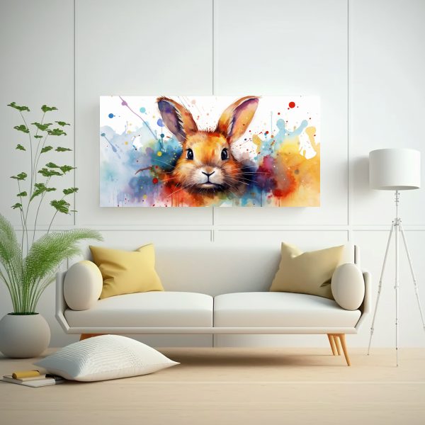 Este cuadro de conejo estrellado en acuarela colorida es perfecto para decorar una pared de acento en tu sala de estar Combínalo con cojines en tonos carmesí, beige y coral para crear un ambiente acogedor y lleno de vida ¡Atrévete a darle un toque de color a tu hogar con este diseño único de DecoCuadros!