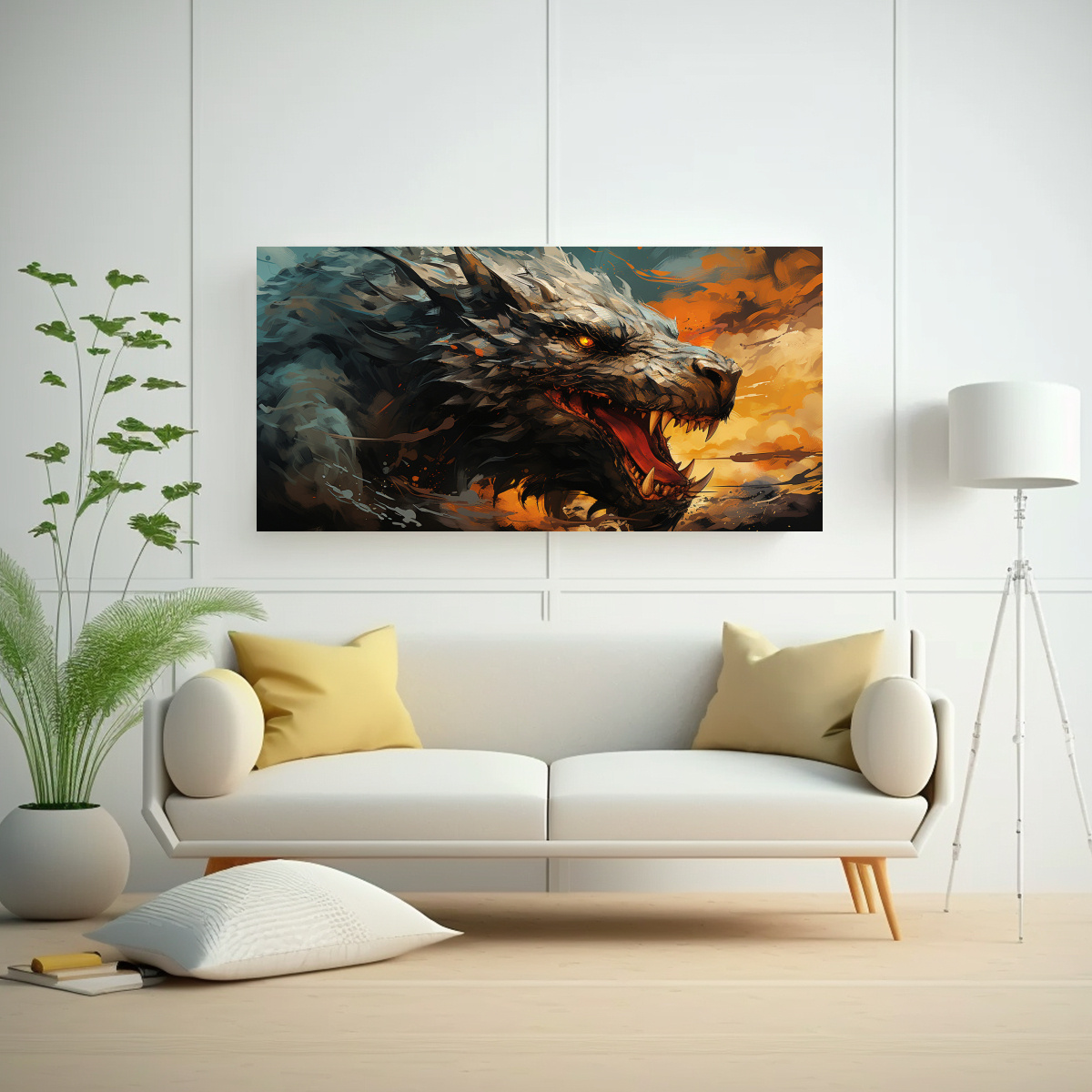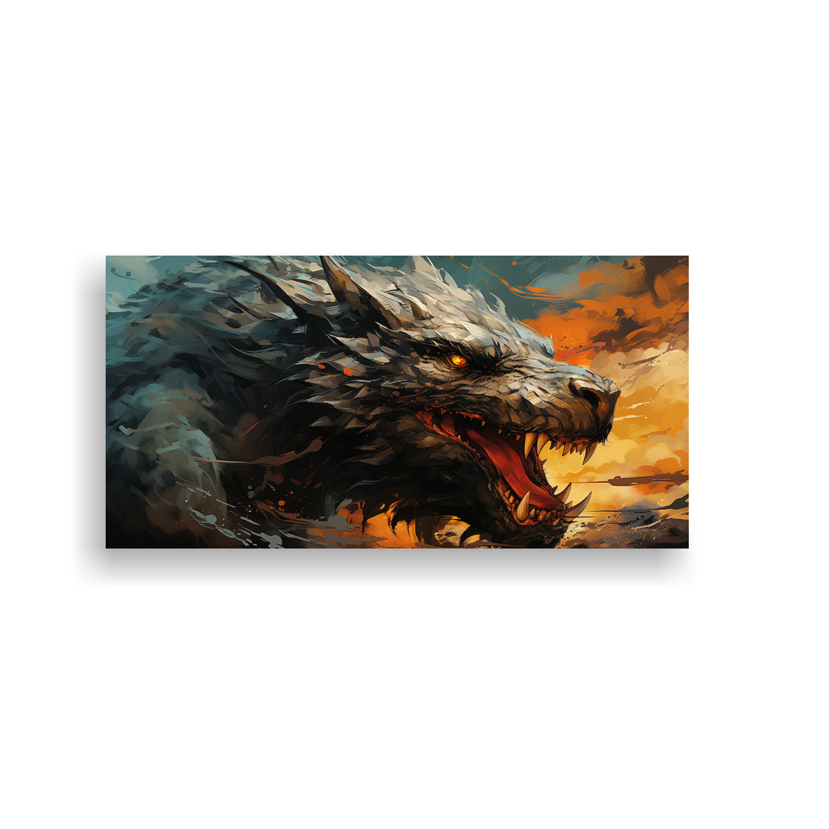 Este cuadro de dragón en rojo y naranja luciría espectacular en la sala de estar, sobre un sofá de tonos neutros Combínalo con cojines en colores plateados y carmesí para resaltar su belleza y crear un ambiente moderno y misterioso