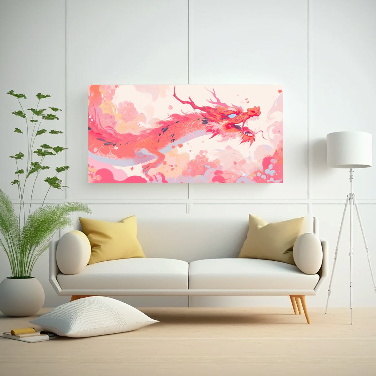 Este cuadro de dragón en tonos pastel y rosa sería ideal para decorar una sala de estar o un dormitorio, creando un ambiente único y lleno de personalidad Combínalo con muebles en tonos neutros para resaltar su belleza y darle protagonismo en la decoración