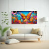 Este cuadro decorativo de escenario psicodélico con mariposas y flores sería perfecto para decorar una sala de estar moderna Combínalo con muebles en tonos neutros como grises y blancos para resaltar los colores vivos del cuadro Colócalo en una pared principal para crear un punto focal llamativo