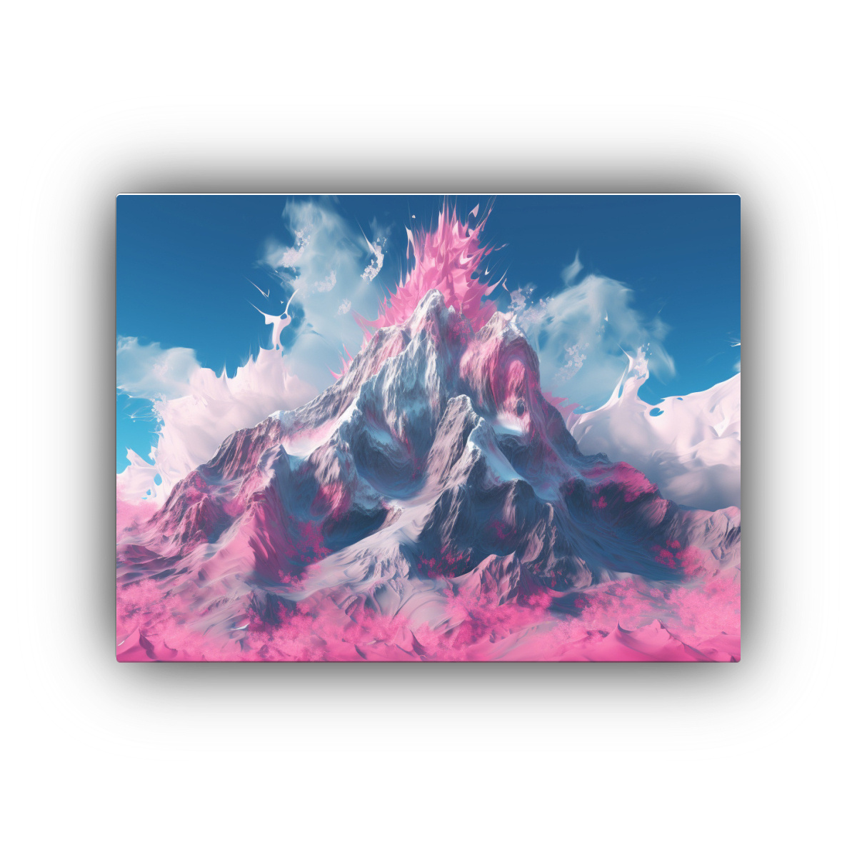 Pintura Decorativa De Montaña Con Cielo Azul Y Flores Rosadas