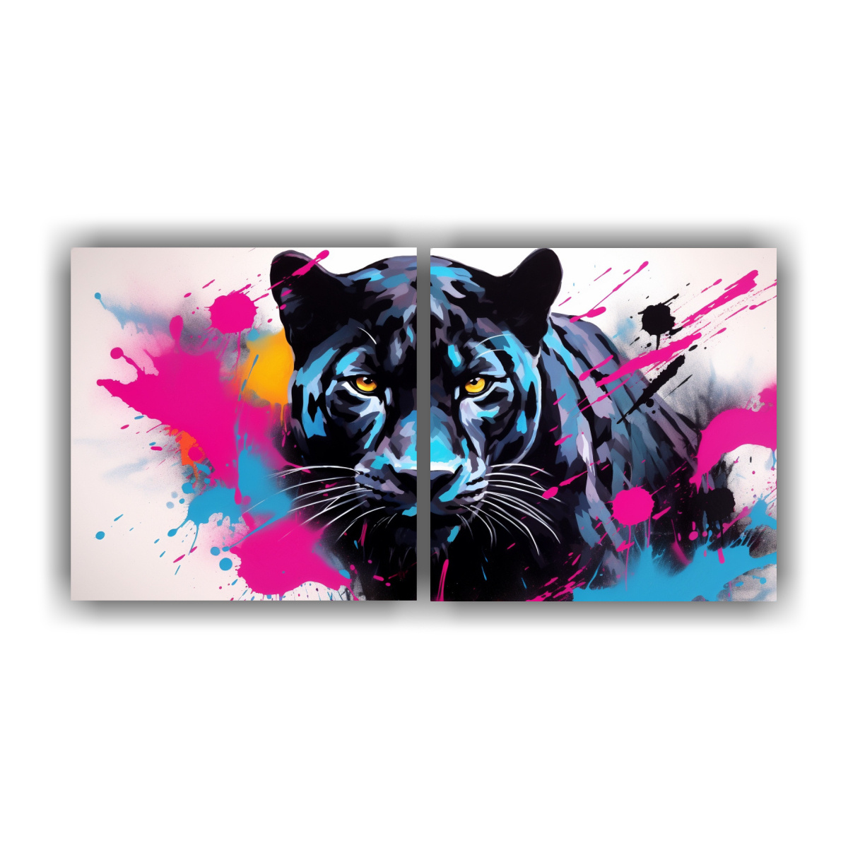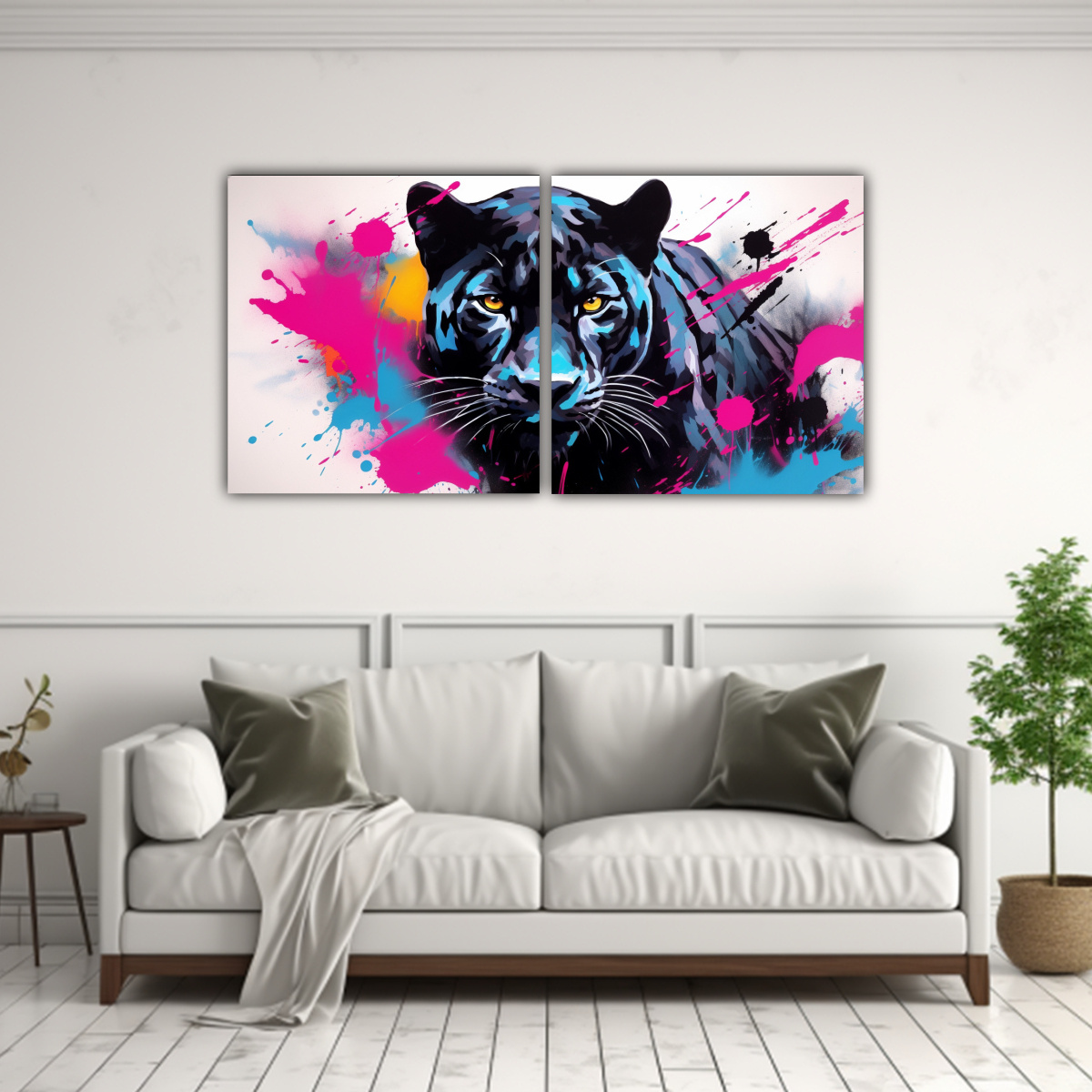 Este cuadro decorativo de pantera negra en estilo neo pop art sería ideal para colocar en la sala de estar sobre un sofá de tonos neutros, resaltando su belleza y elegancia Complementa el ambiente con cojines en tonos dorados y turquesa para una decoración sofisticada