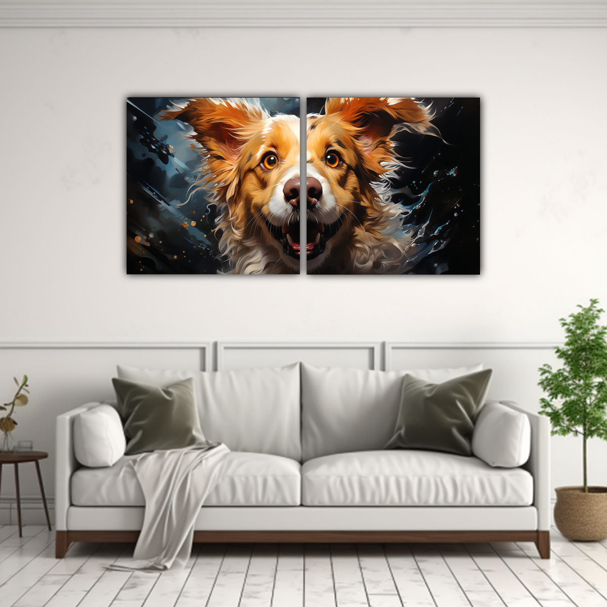 Este cuadro A Rabbit Colorful en dos telas quedaría perfecto en la sala de estar, sobre un sofá de color neutro para resaltar sus tonos vibrantes Combínalo con cojines en tonos similares para un ambiente acogedor