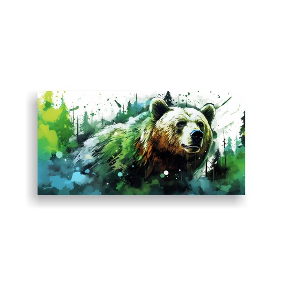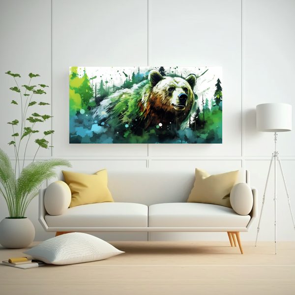 Dale vida a tus espacios con este arte de pared único Colores como beige, azul marino grisaceo, menta, dorado, verde azulado y chocolate se combinan en un diseño exclusivo ¡Renueva tu comedor con este grizzly bear in fern neo pop art!