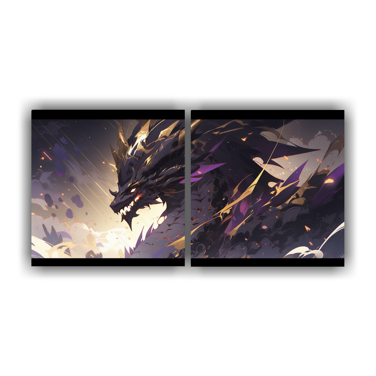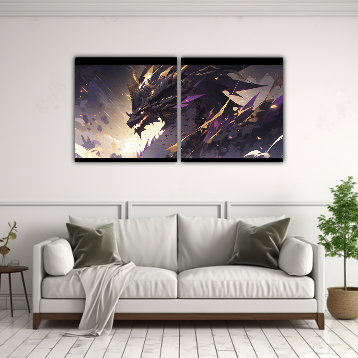 Este cuadro de un dragón en púrpura y dorado con atmósfera neonoir lucirá espectacular en la sala de estar sobre un sofá oscuro para resaltar los colores y crear un ambiente mágico Combínalo con elementos dorados y plateados para una decoración sofisticada y moderna