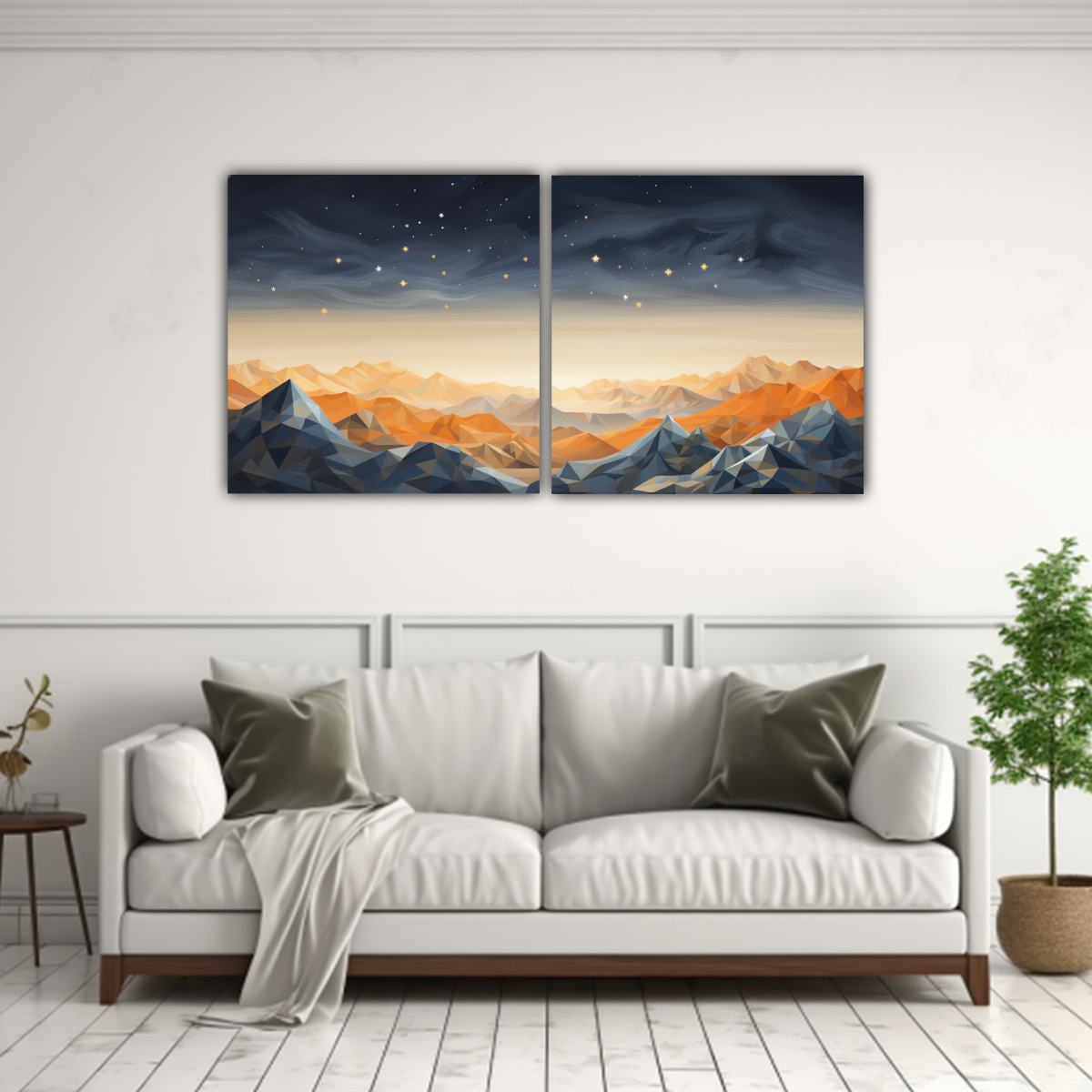 DecoCuadros presenta un cuadro decorativo elegante con estilo montaña de creativa simetría, con una paleta de colores que incluye plateado, azul marino grisaceo, gris, coral, dorado y carmesí Nuestros cuadros están impresos en tela de alta calidad con bastidores de madera, ofreciendo la mejor calidad del mercado a precios económicos Además, contamos con diseños exclusivos, entregas rápidas y gratuitas en Santiago y envíos express a regiones Decora tu espacio con estilo y crea un ambiente único con nuestros cuadros decorativos