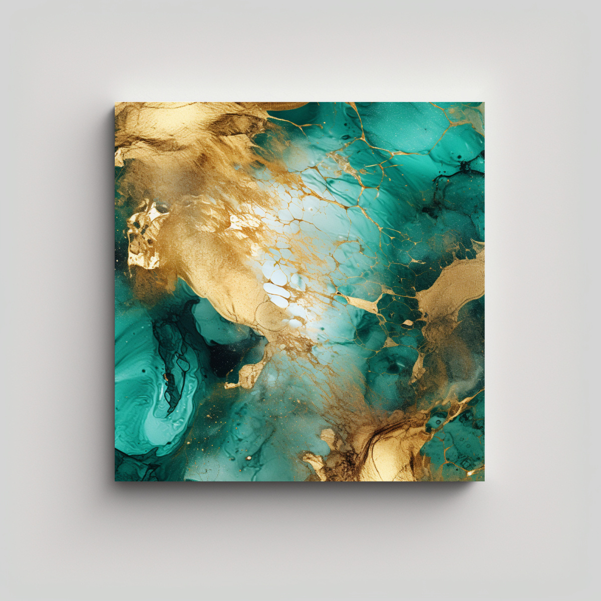 Pintura Decorativa En Bastidor De Alta Resolución En Fondo De Tinta Turquesa Sutil Y Dorado A Pantalla Completa