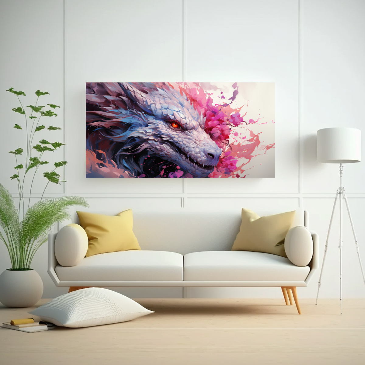 Este cuadro decorativo en tela canvas con profundidad de dragón en colores blanco y rosa quedaría perfecto en la sala de estar sobre un mueble de tonos neutros, como blanco o gris Añadirá un toque de sofisticación y modernidad a tu espacio