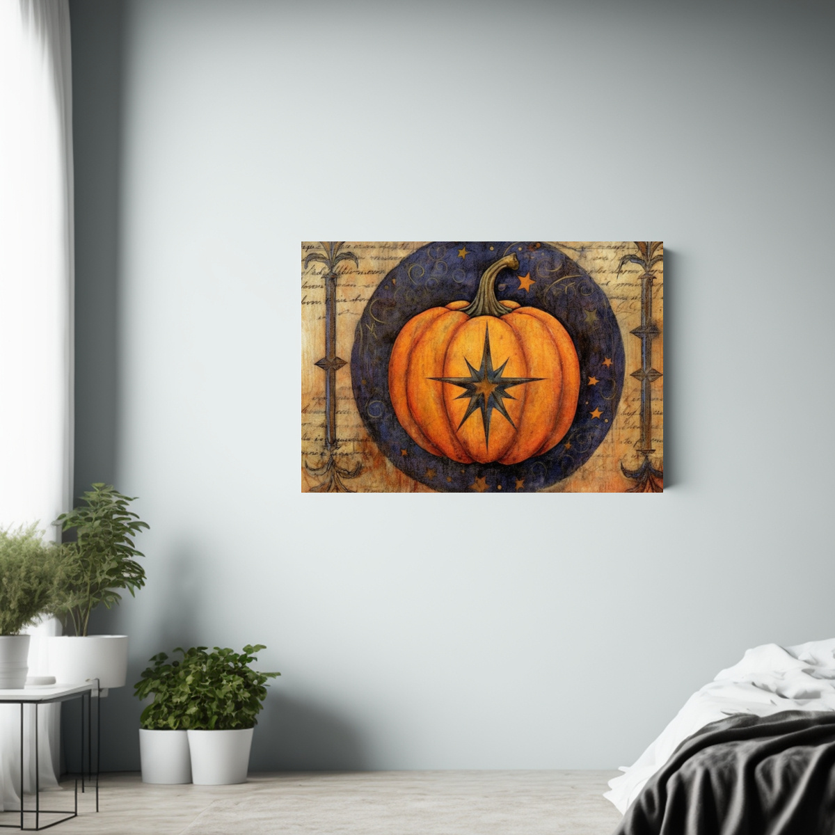 Este cuadro de Halloween con calabazas y elementos mixtos sería perfecto para decorar tu sala de estar junto a una iluminación tenue y velas aromáticas, creando un ambiente mágico y acogedor Combínalo con muebles en tonos neutros para resaltar su diseño único