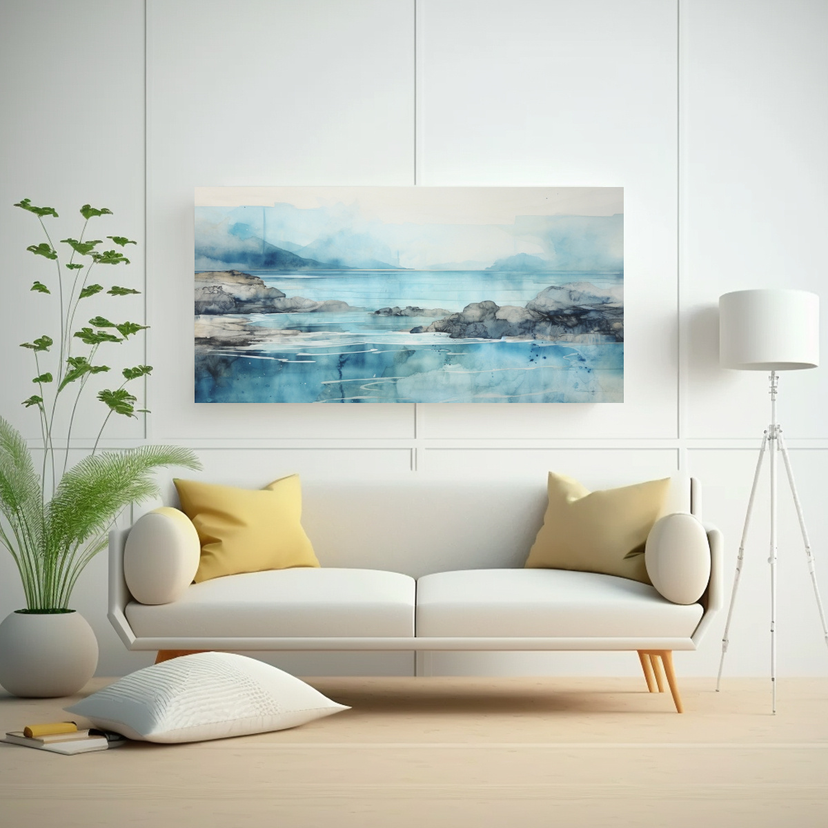 Cuadro decorativo horizontal en contraste con acuarela azul, verde azulado y plata Diseño exclusivo y entrega rápida y gratuita en Santiago