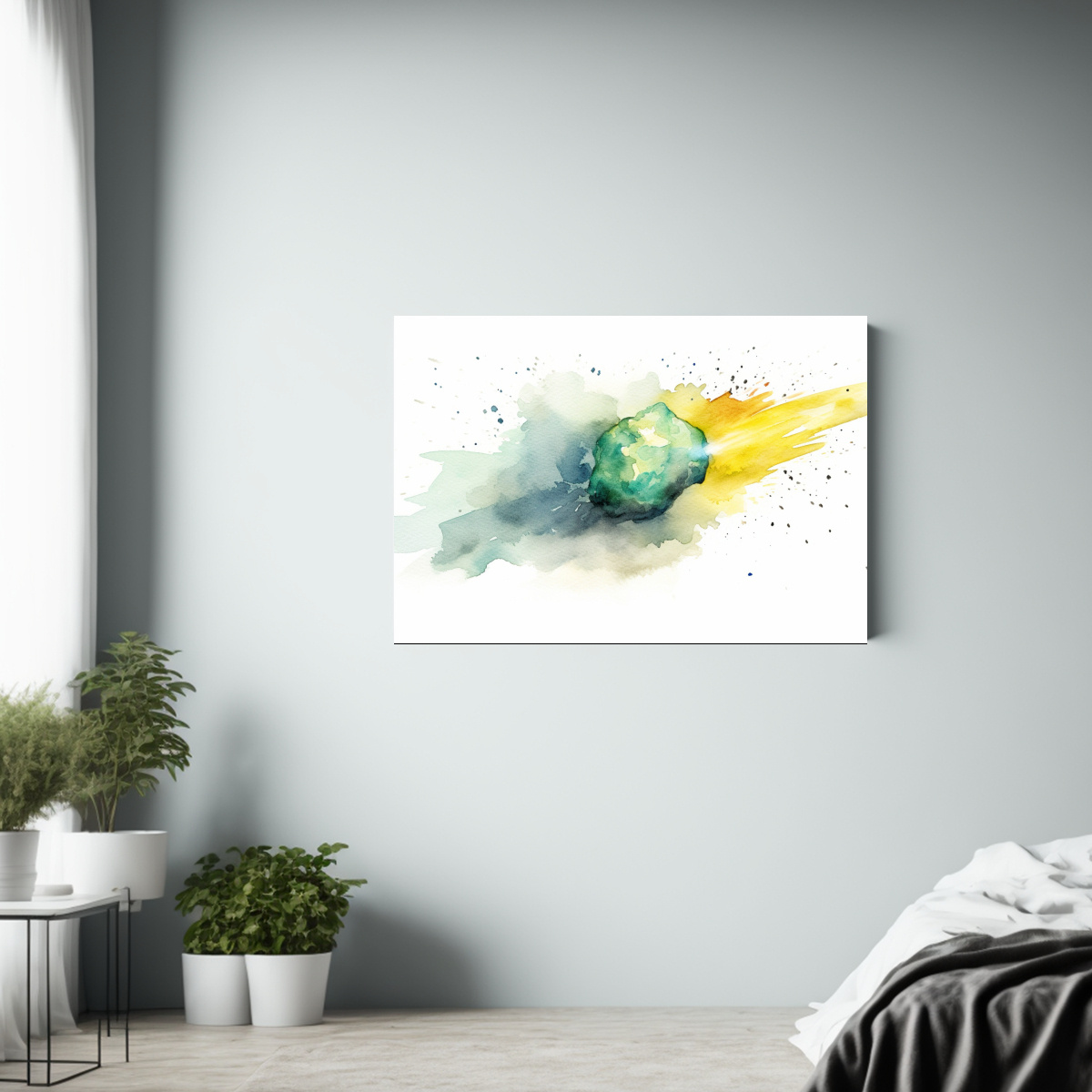 Este cuadro de meteorito en acuarela sería perfecto para colocar en la sala de estar sobre un sofá en tonos neutros como beige o gris, destacando así la elegancia y modernidad del diseño Combínalo con cojines en colores turquesa y dorado para lograr un ambiente sofisticado y armonioso