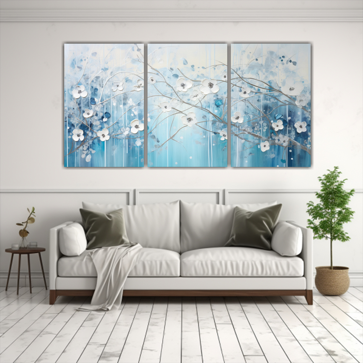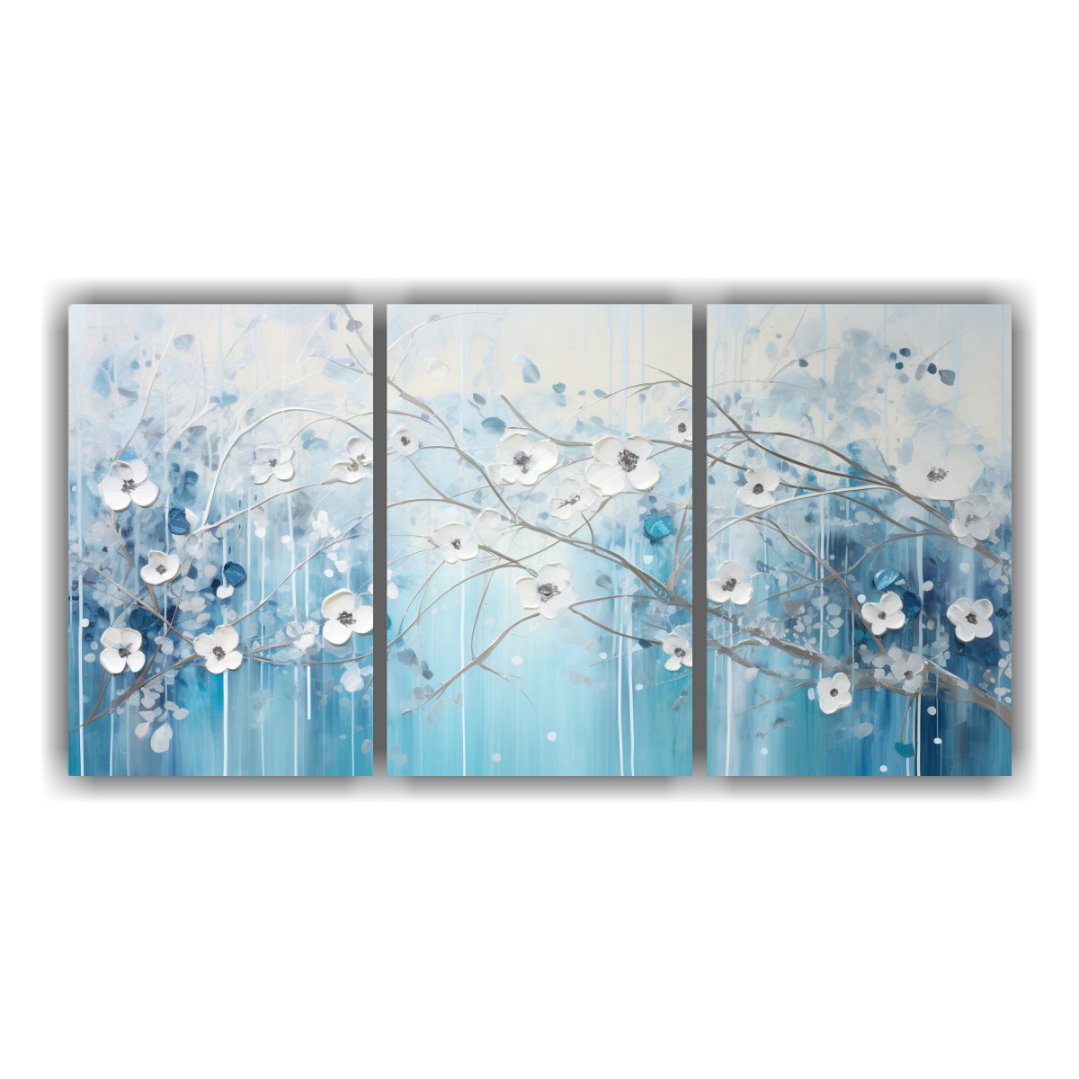 Pintura Decorativa Moderna Clásica En Azul Y Plata Estilo A Juego De 3 Composiciones