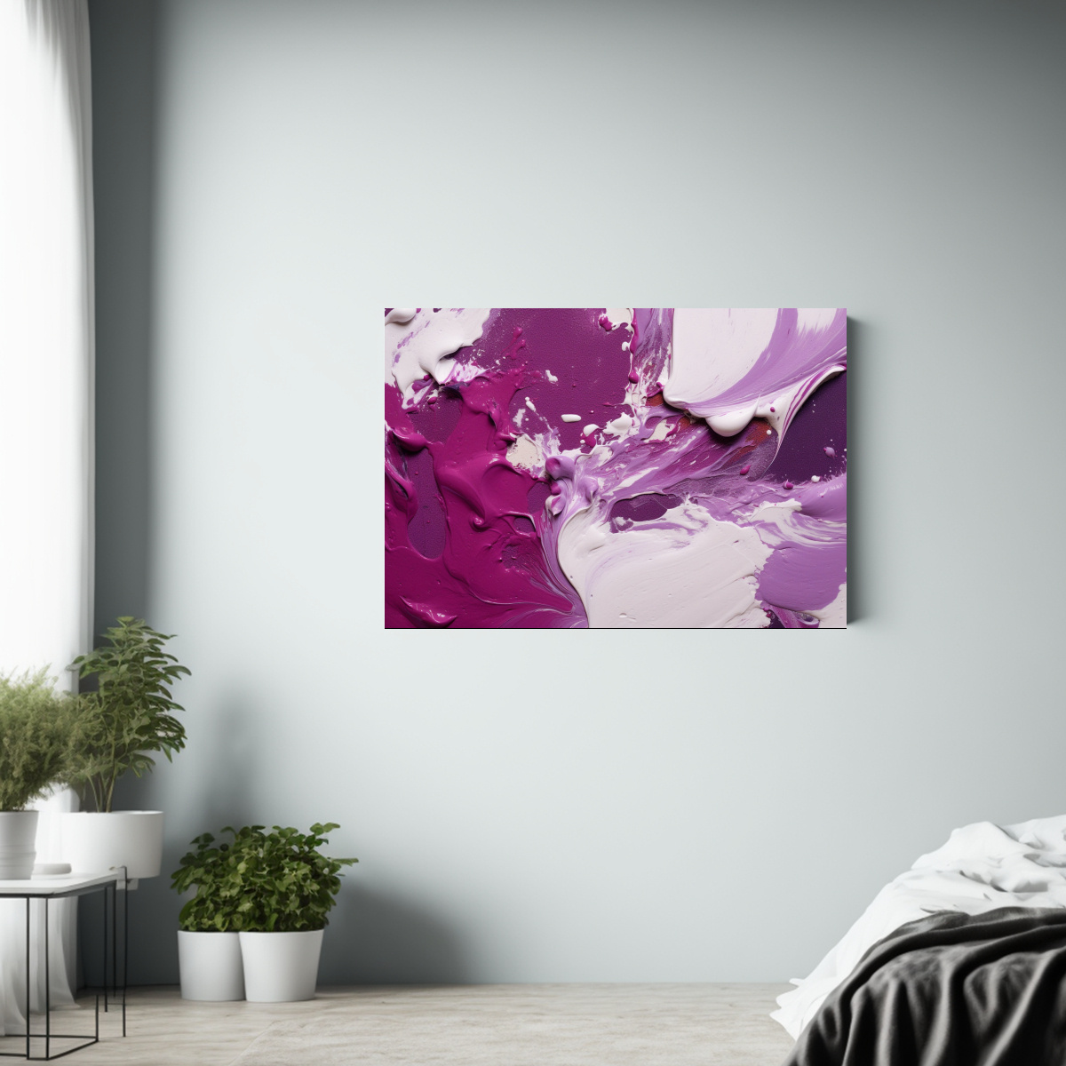 Este cuadro es ideal para decorar salas de estar o dormitorios con una paleta de colores similar, como blancos, morados y grises Colócalo sobre un sofá o una cómoda para crear un punto focal sofisticado en tu espacio