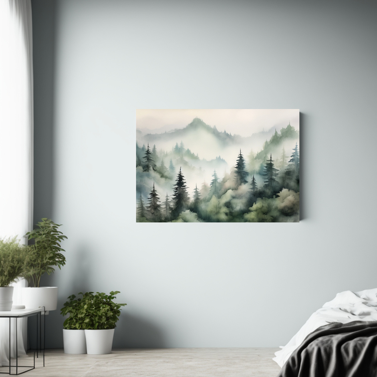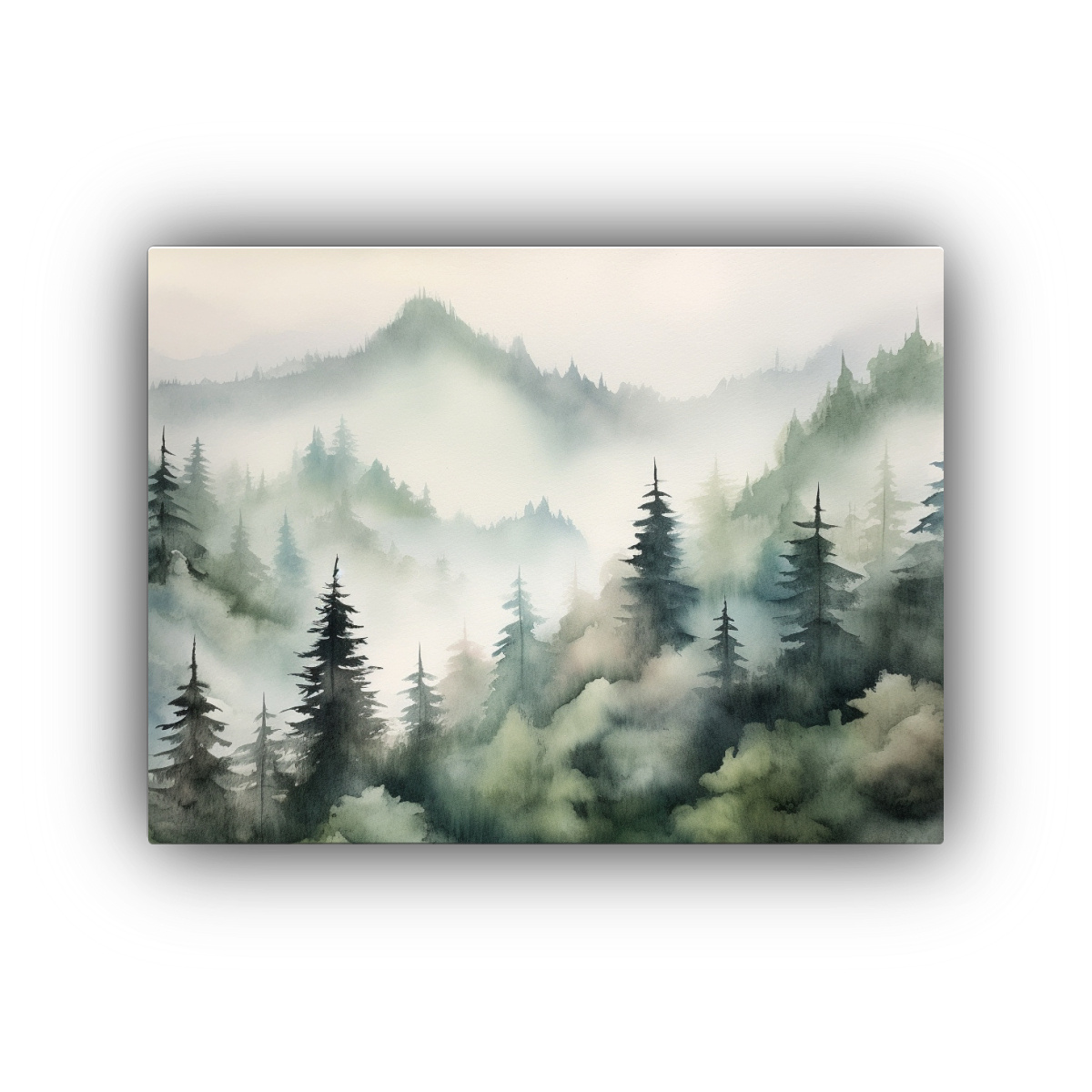 Pintura Decorativa: Montaña Cubierta De Niebla En Acuarela Serena.