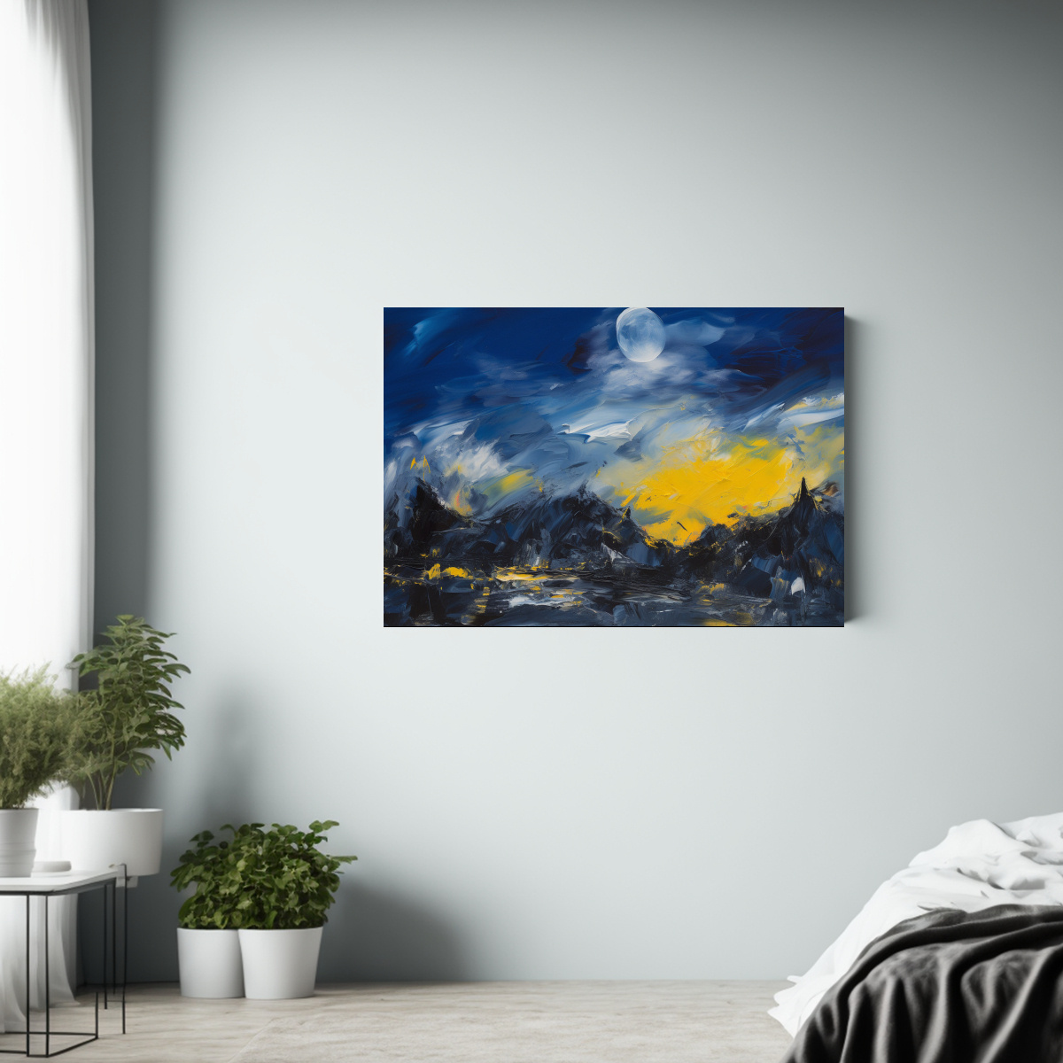 Pintura Decorativa: Pequeña Luna Amarilla En Cielo Oscuro Y Azul.