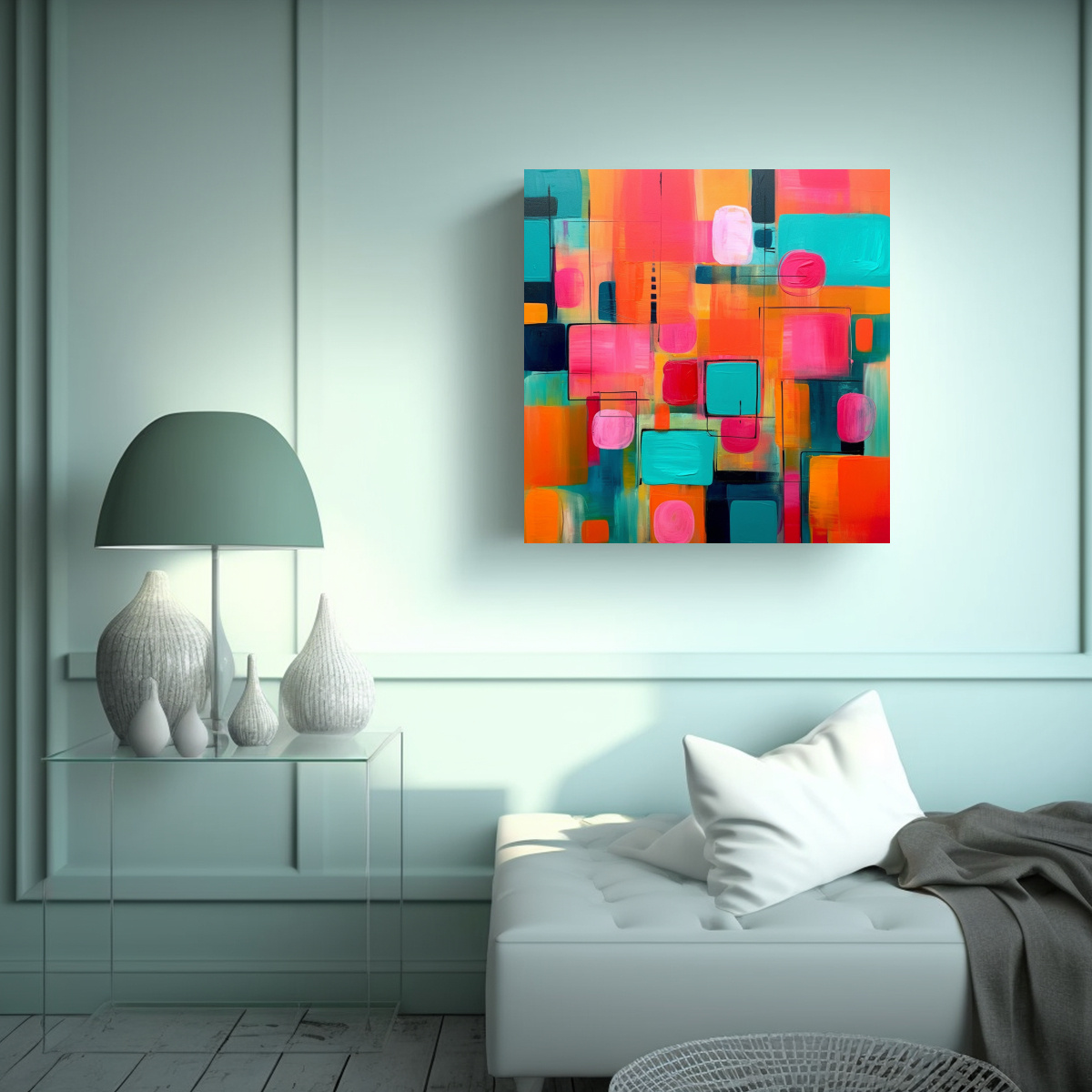 Pintura Decorativa Salón En Tonos Turquesa, Rosa Y Naranja