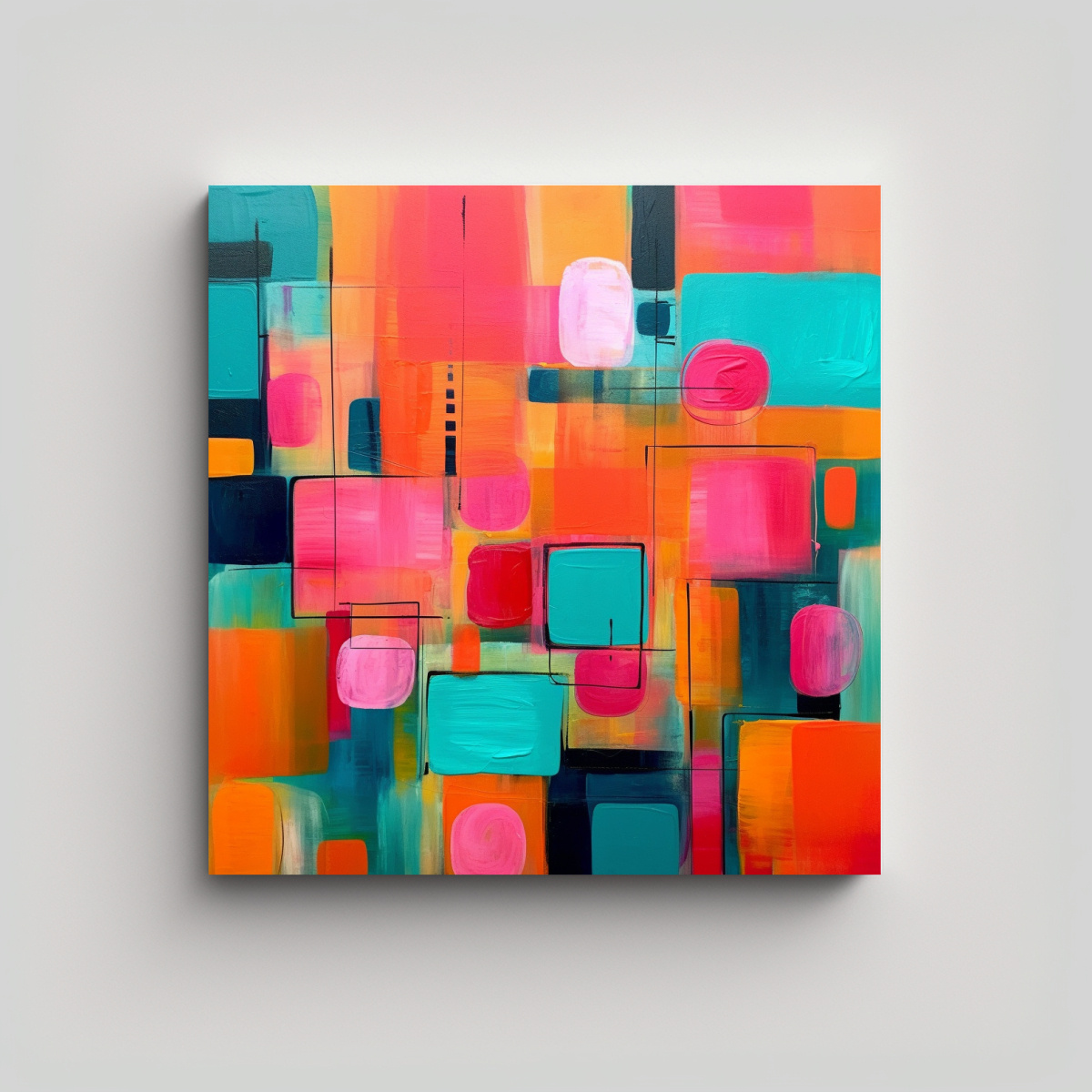 Nuestro cuadro decorativo salón en tonos turquesa, rosa y naranja es perfecto para darle vida y color a tu espacio Los colores verde azulado, coral, lila, cian, plateado, carmesí, menta y chocolate se combinan de manera armónica para crear una pieza única y llamativa Su diseño abstracto le dará un toque moderno y sofisticado a tu salón