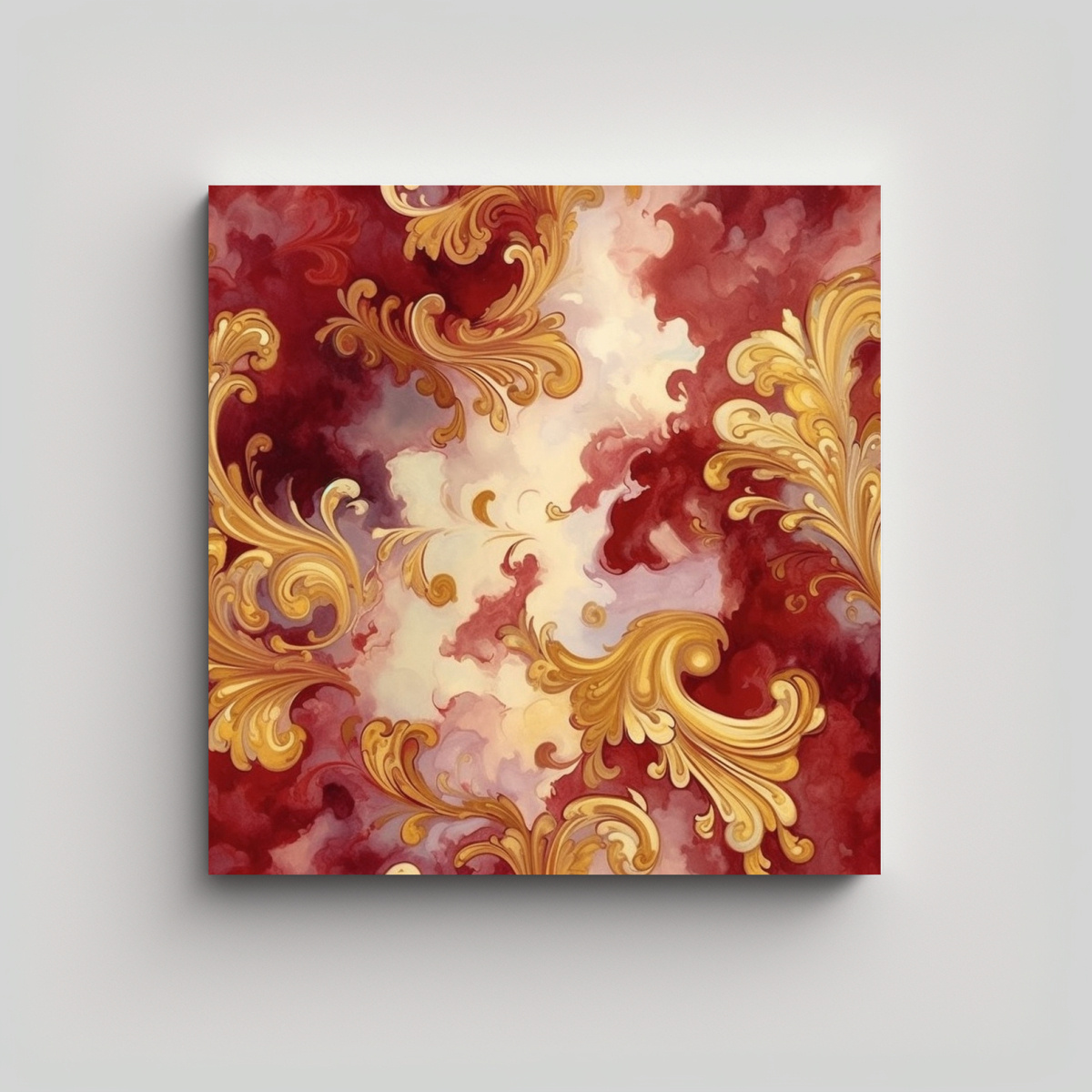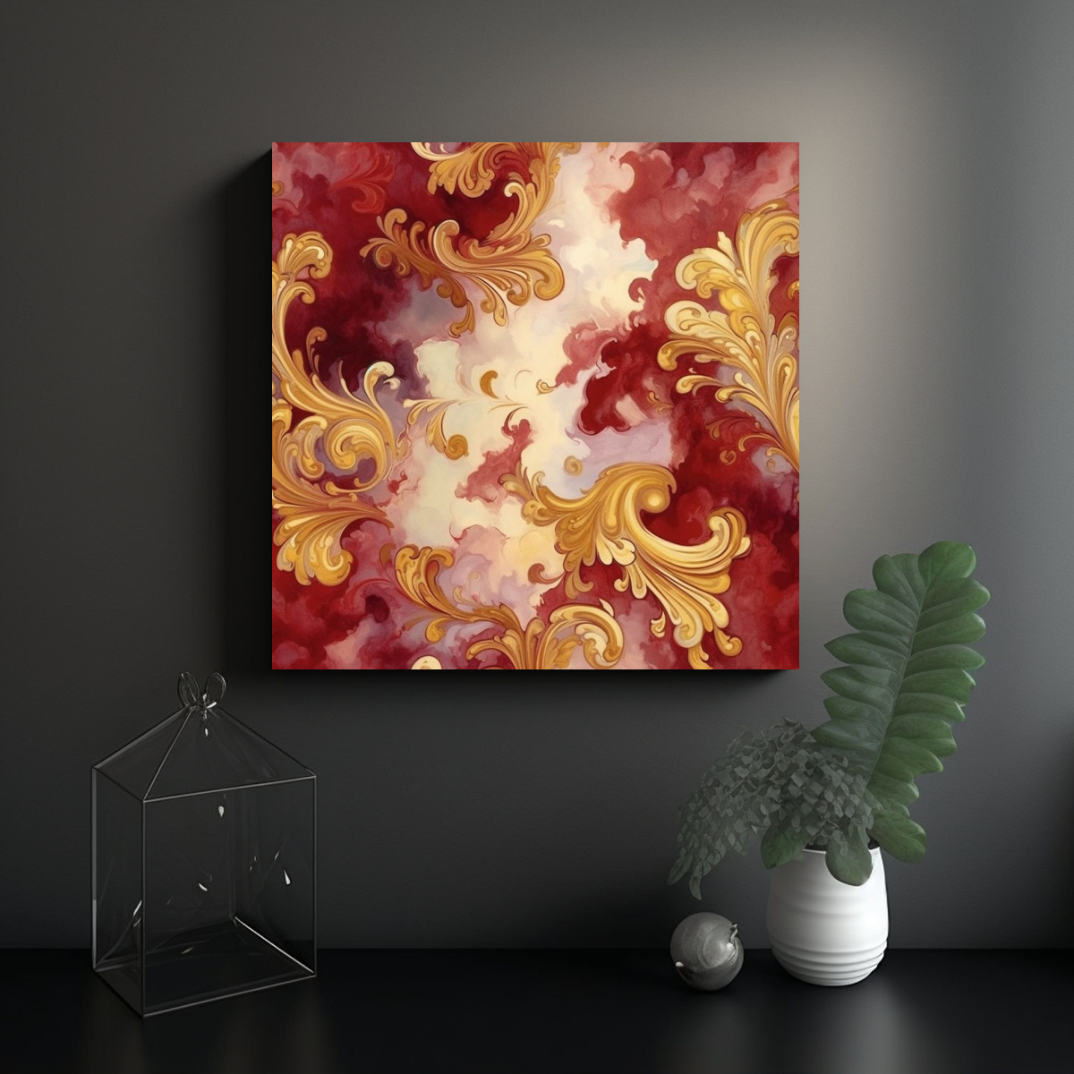 Este cuadro dinámico en tonos granate y dorado sería ideal para colocar sobre una pared blanca para crear un contraste llamativo Combínalo con muebles en tonos neutros como beige o blanco para resaltar su elegancia y sofisticación