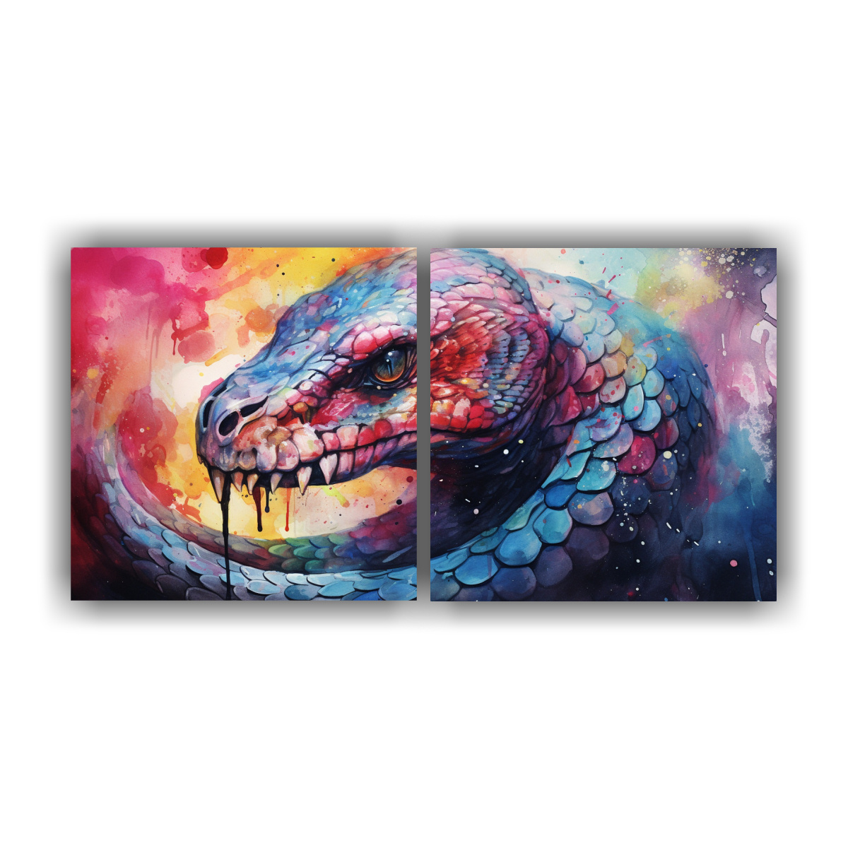 Pintura En Acuarela Estilo Cobra Colorida En 2 Telas En Bastidor