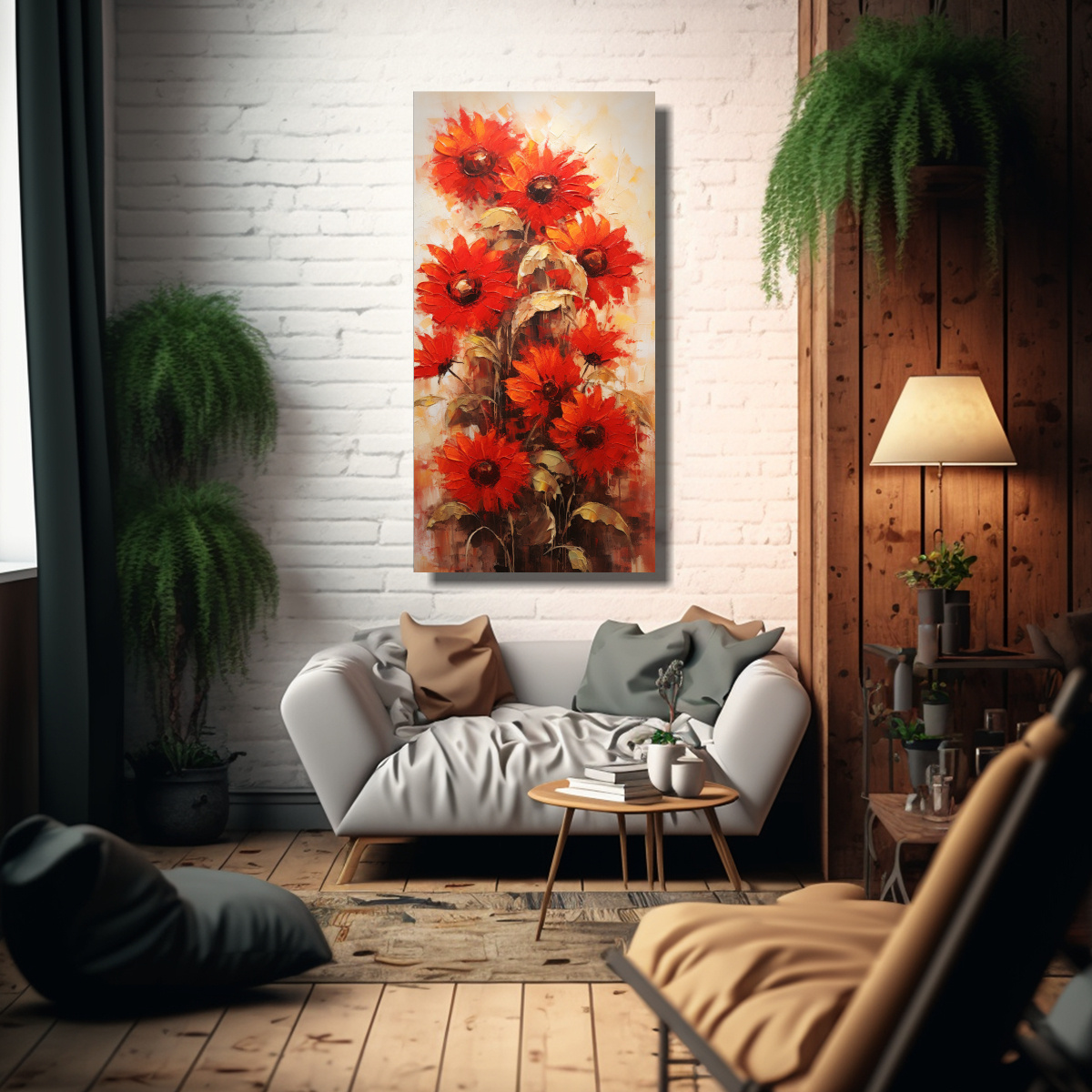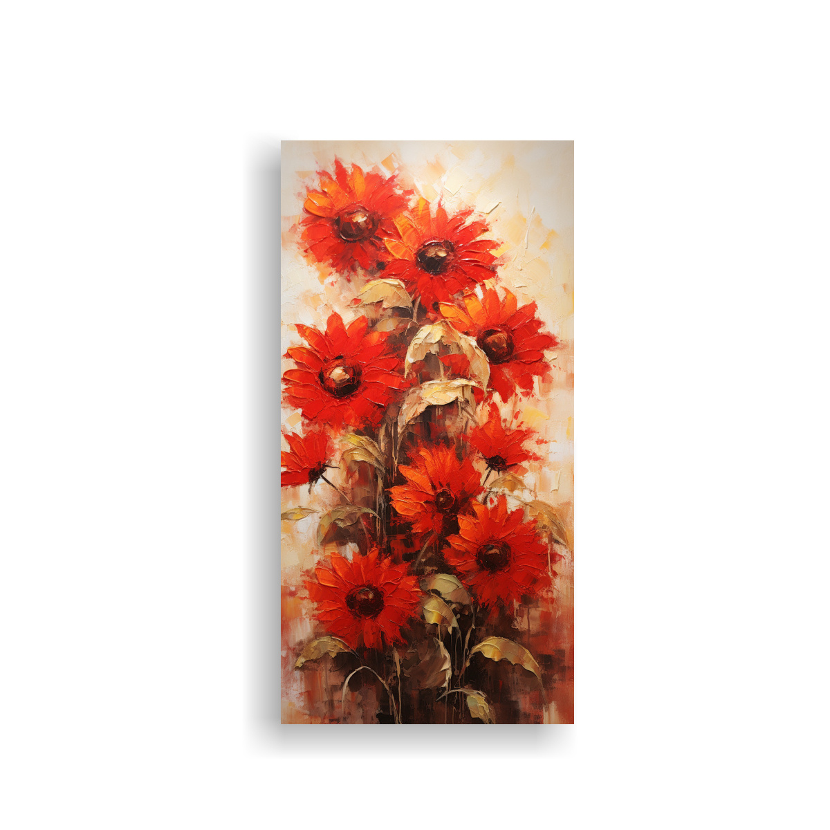 Recomendamos colocar este cuadro abstracto de girasoles rojos en el estilo Impactante a red sunflowers painting on canvas en el salón principal de tu hogar Sus colores vibrantes y su diseño moderno agregarán energía y vitalidad al espacio, convirtiéndolo en el centro de atención Combínalo con muebles en tonos neutros y accesorios decorativos en colores cálidos para crear un ambiente acogedor y moderno ¡Haz de tu hogar un lugar único con los cuadros decorativos de DecoCuadros!