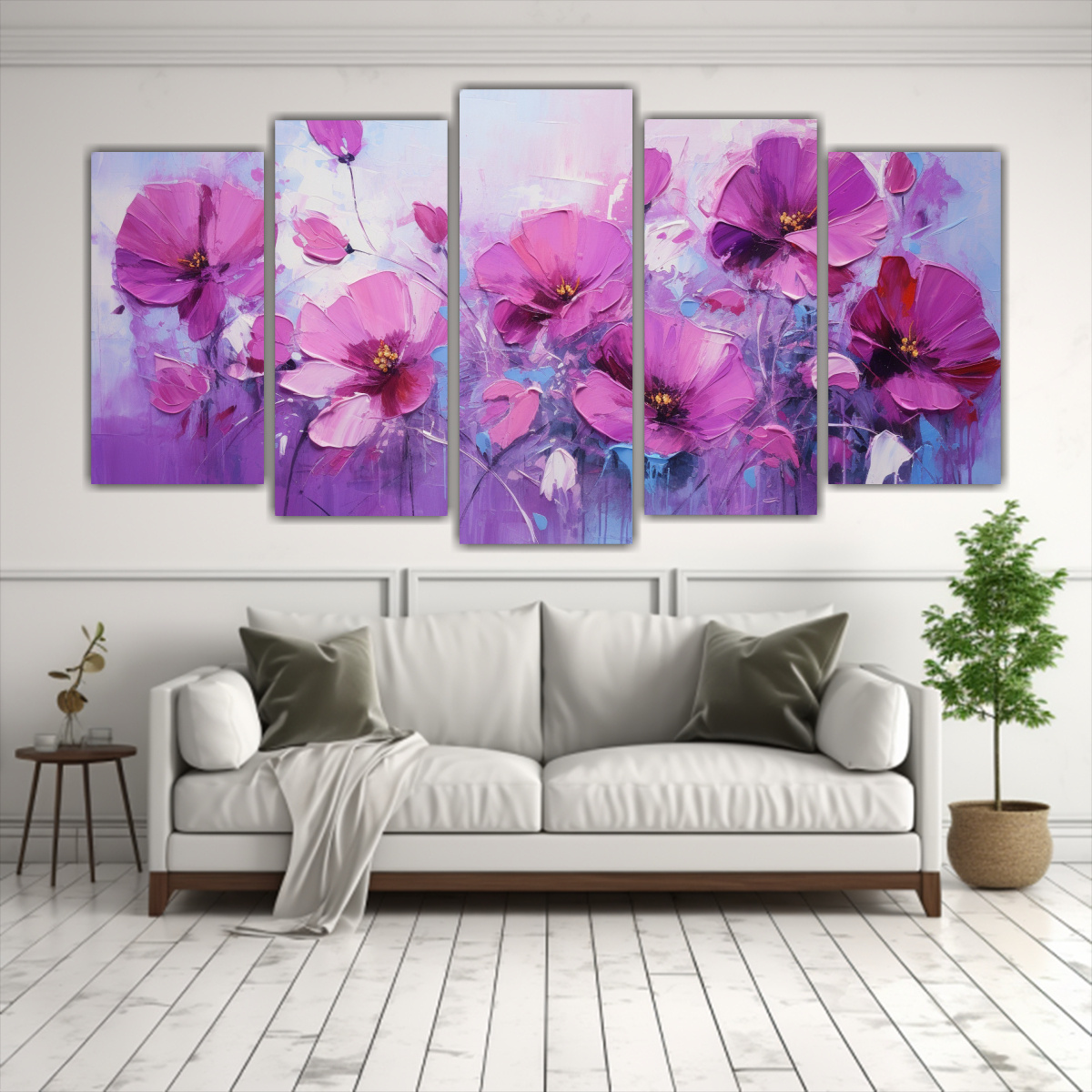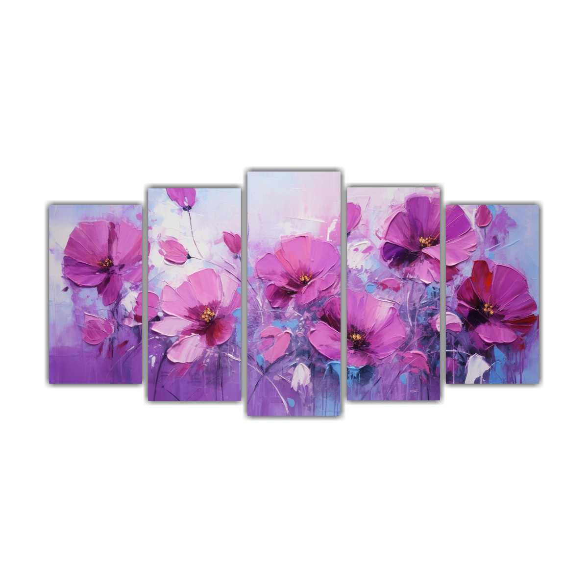 DecoCuadros te ofrece esta impresionante pintura en bastidor compuesta por cinco telas en tonos púrpura y magenta Confeccionado con materiales de la mejor calidad, este cuadro es perfecto para darle vida a tu hogar u oficina