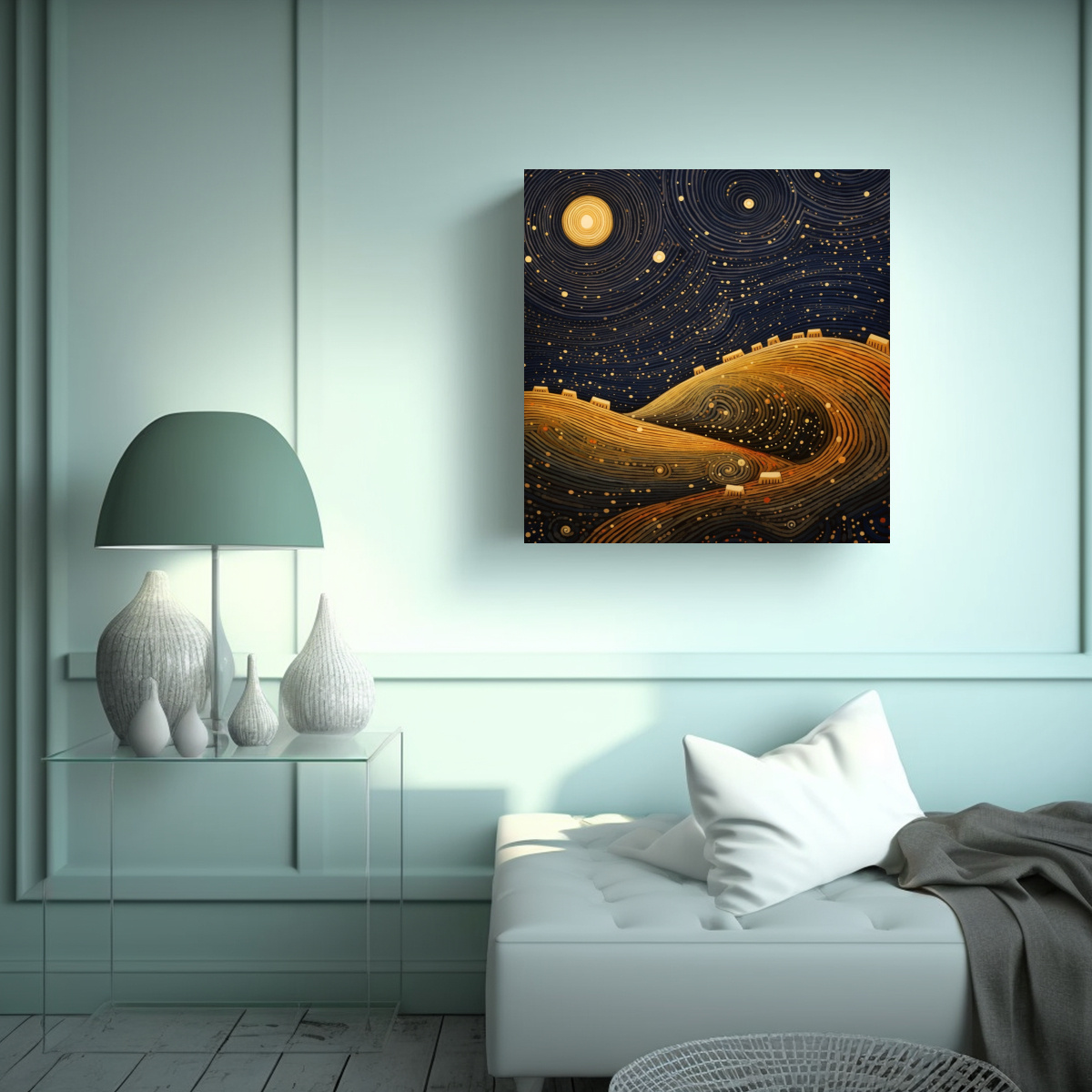 Este cuadro es ideal para decorar el dormitorio, creando un ambiente tranquilo y relajante Puedes colocarlo sobre la cabecera de la cama o en una pared vacía para crear un punto focal Combínalo con muebles de tonos neutros o claros y accesorios en colores que complementen los tonos del cuadro, como cojines en tonos azules o cortinas en tonos grisáceos ¡Agrega un toque de magia a tu habitación con esta hermosa pintura en bastidor!