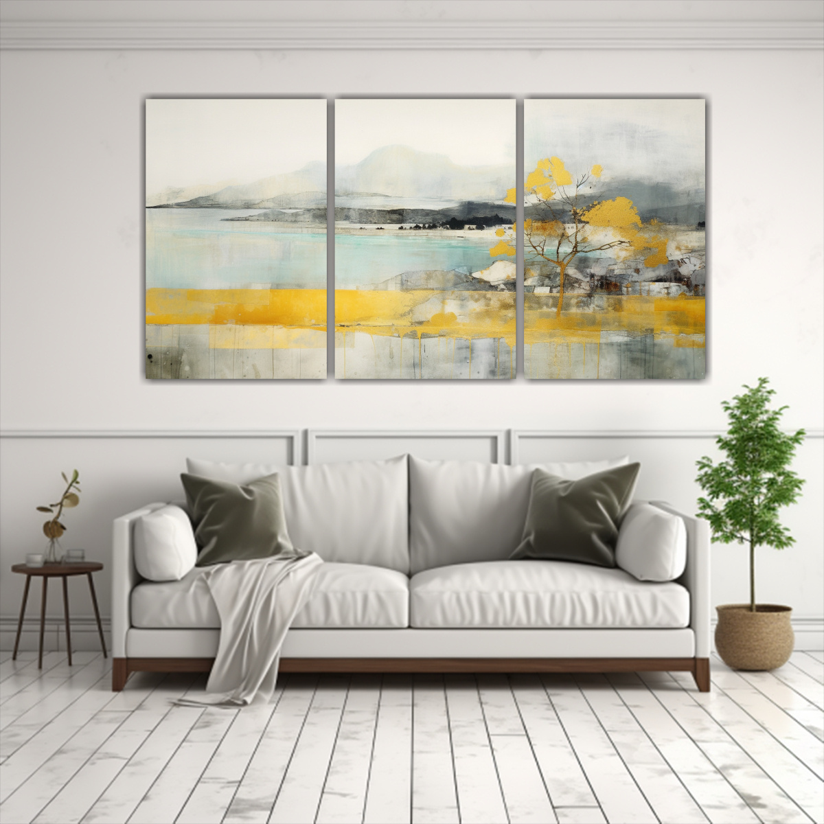 Este cuadro queda perfecto en salas de estar modernas Puedes colocarlo sobre un sofá gris para resaltar los tonos plateados y dorados, o en una pared coral para crear un contraste vibrante ¡Atrévete a darle un toque de vanguardia y brillo a tu hogar con nuestra Pintura en Bastidor con Tres Telas en Agua Amarillo, Turquesa y Plata!