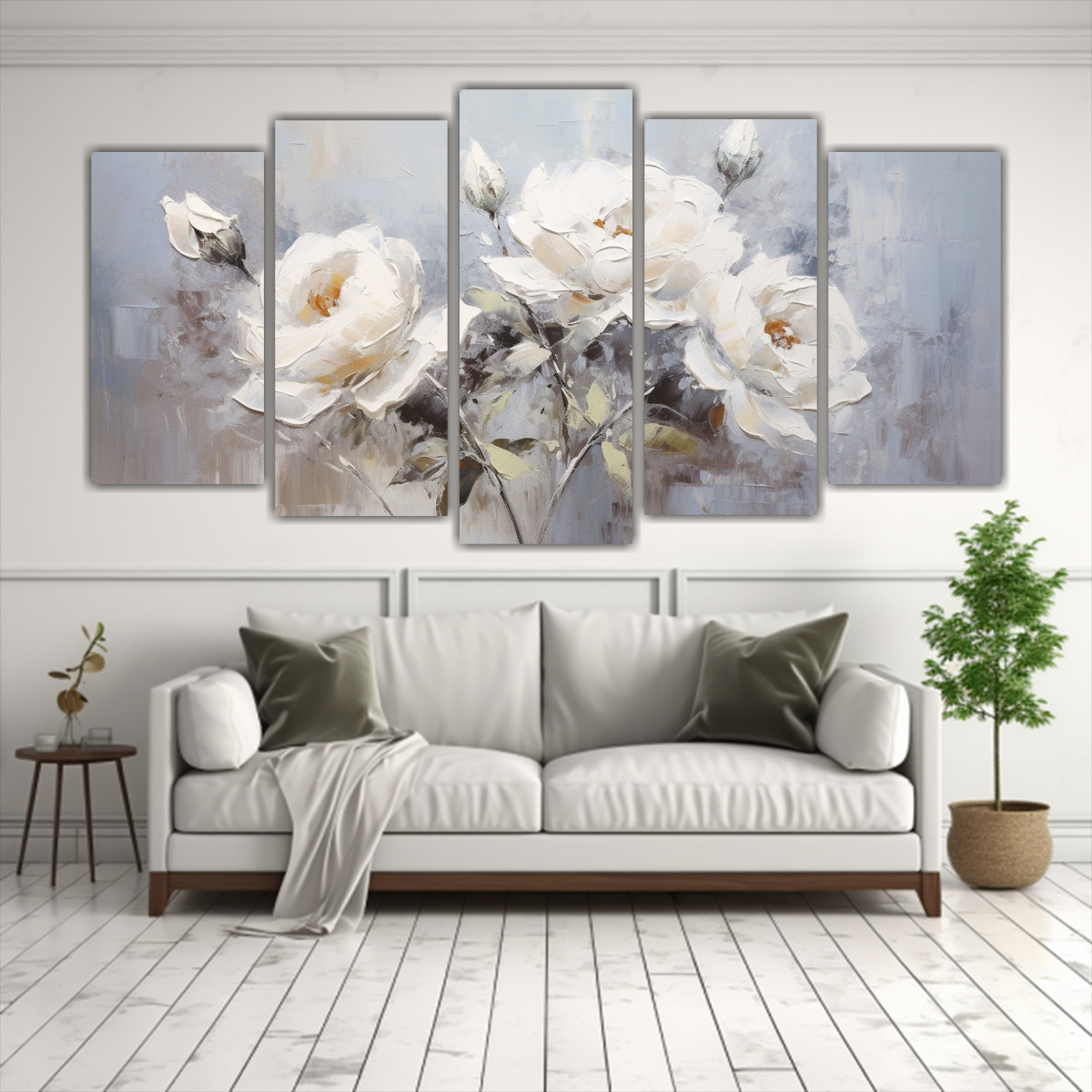 Este cuadro de rosas blancas estilo colorido en lienzo se vería magnífico en un dormitorio o sala de estar con una decoración moderna Colócalo sobre un sofá de color neutro para que los colores del cuadro resalten y se conviertan en el punto focal de la habitación Combínalo con cojines decorativos en tonos plateados, azules y grises para completar la apariencia y crear un ambiente relajante y elegante