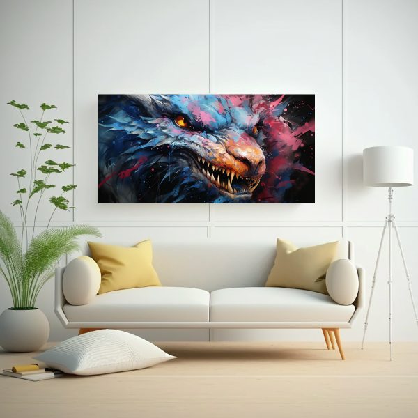 Añade un toque de misterio y elegancia a tu hogar con el cuadro ‘Pintura en bastidor: Dragón vibrante en azules’ Con entrega rápida y gratuita en Santiago, podrás disfrutar de este arte único en pocos días Atrévete a darle un estilo neonoir a tu espacio