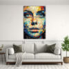 Este cuadro es perfecto para darle vida a tu sala de estar Puedes colocarlo sobre un sofá de color neutro para resaltar los tonos vibrantes del rostro de mujer hecho de un caleidoscopio de colores También puedes combinarlo con cojines en tonos azules, plateados y grises para crear un ambiente armonioso y moderno ¡Deja que este cuadro sea el centro de atención de tu sala y sorprende a tus invitados con un toque de originalidad!