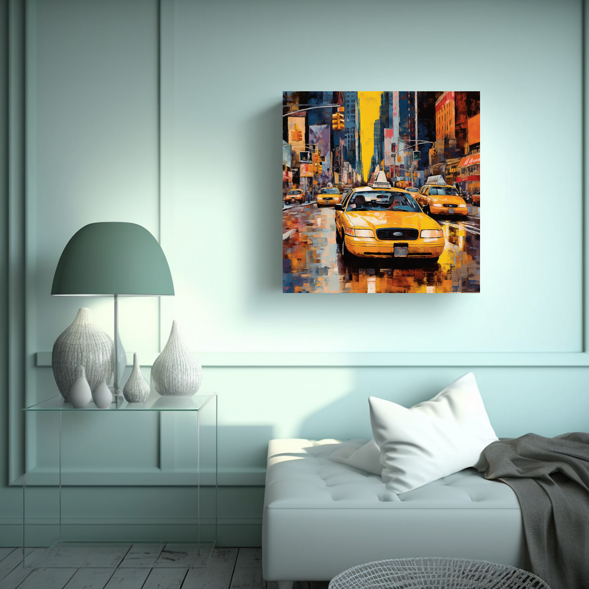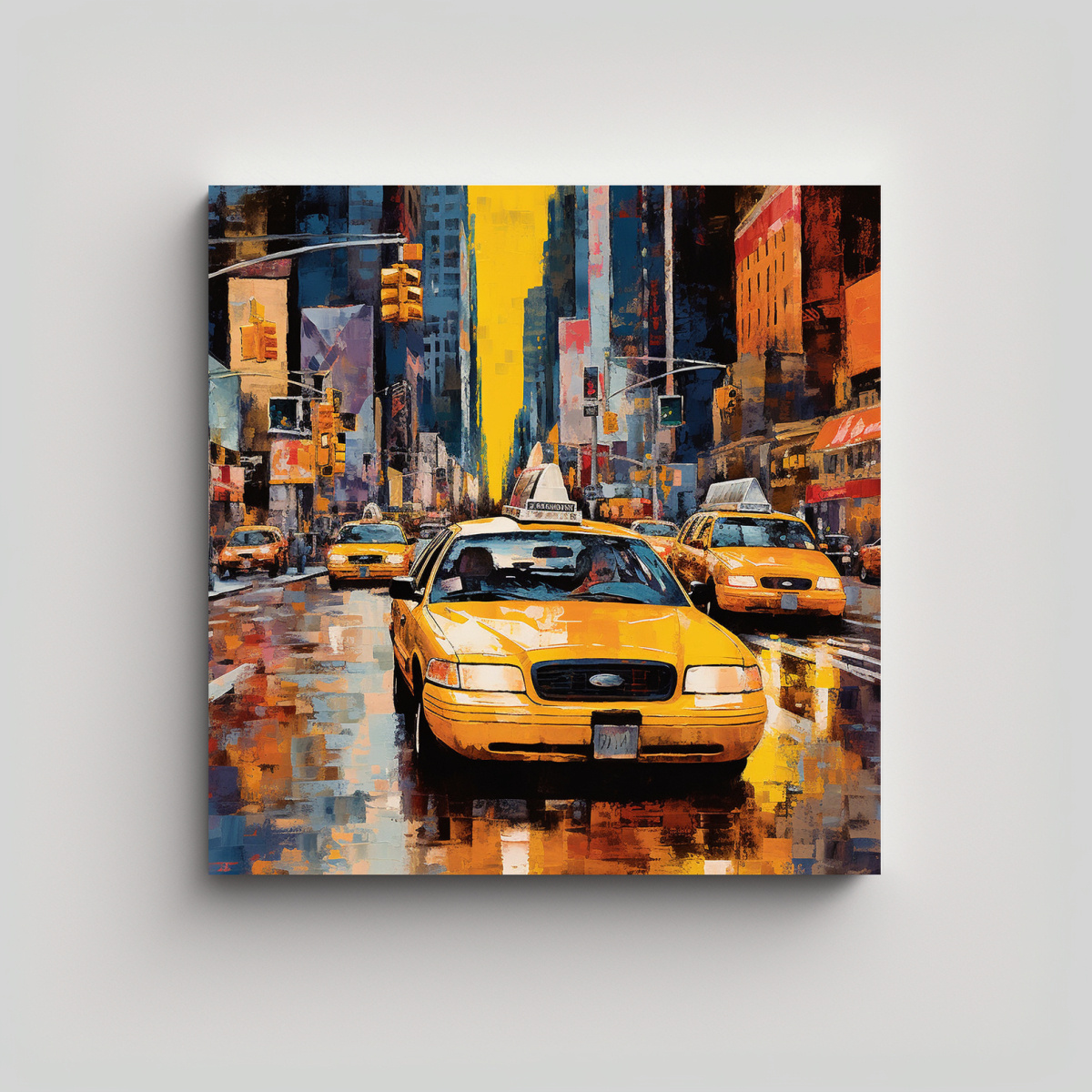 El cuadro Pintura en Bastidor Expresión Estrellados en Taxi Amarillo de Nueva York es perfecto para dar vida y color a tus paredes Impreso en tela de alta calidad y con un diseño exclusivo, este cuadro te transportará al bullicioso Manhattan