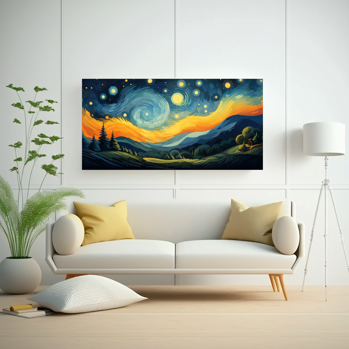 Este cuadro es perfecto para decorar tu sala de estar o dormitorio Puedes colocarlo sobre un sofá o una cama para crear un punto focal en la habitación Combínalo con cojines en tonos azules y blancos para resaltar los colores del cuadro y agregar un toque de serenidad ¡Atrévete a darle vida a tus espacios con esta hermosa reinterpretación de la Noche Estrellada de Van Gogh!